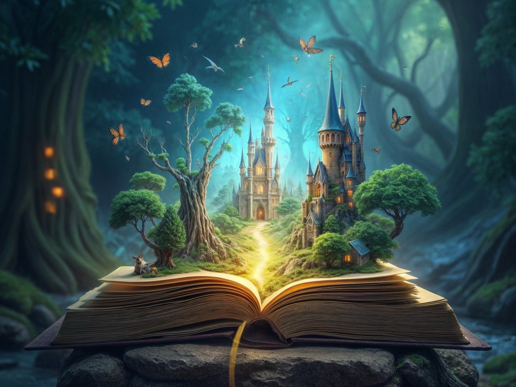 An enchanted book opens to reveal a mystical scene: a castle in a forest and two animals, a goat and a cat, surrounded by vibrant greenery and magical light, creating an otherworldly atmosphere.