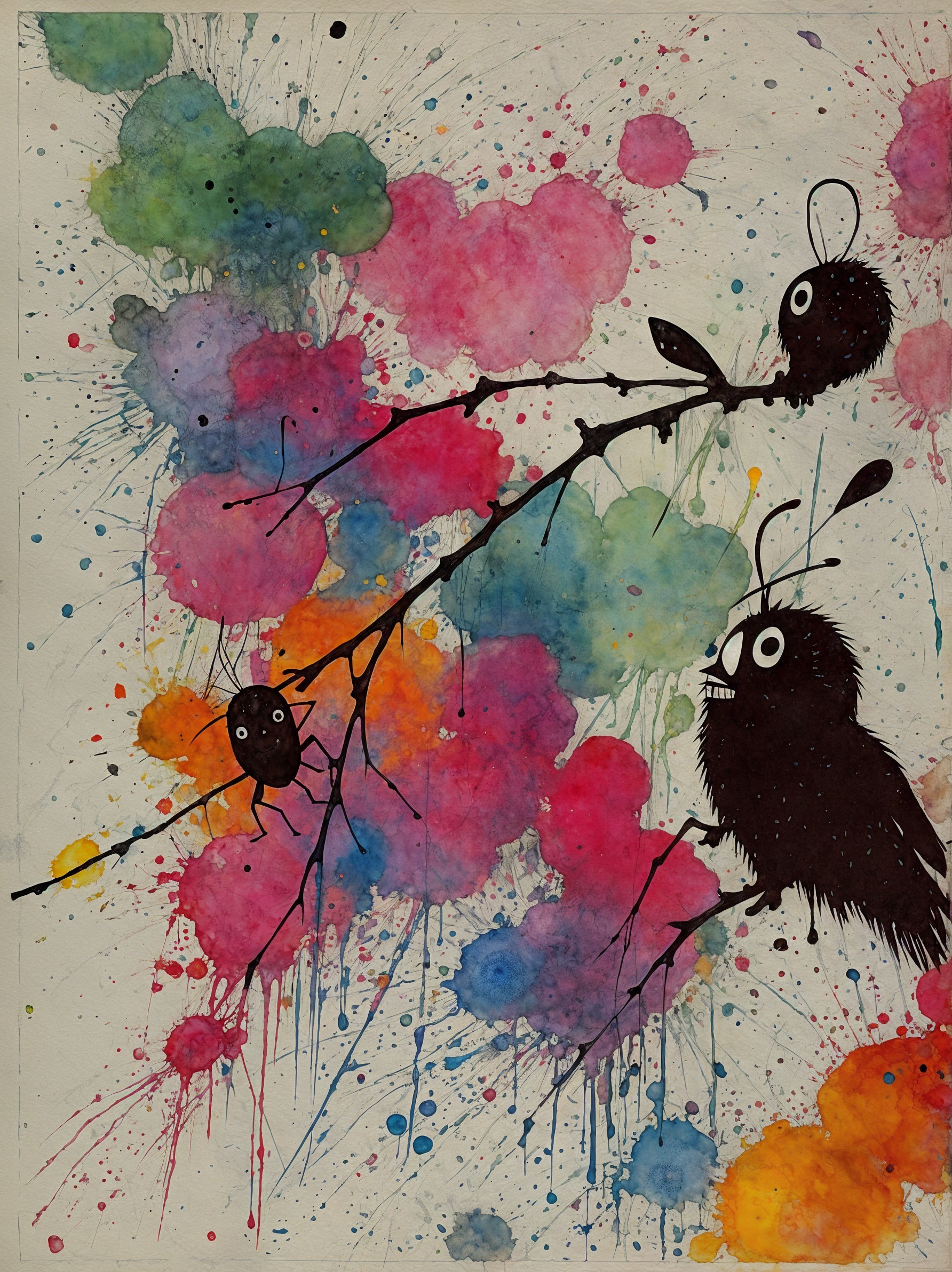 The image features a vivid watercolor background with splashes of pink, blue, and orange. Silhouettes of birds and insects are perched on branches, creating a striking contrast with the colorful backdrop.