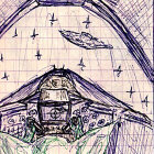 A colorful sketch depicts the interior of a spacecraft cockpit, with a view of stars and a distant ship through the window. The control panel is detailed, with various buttons and screens.