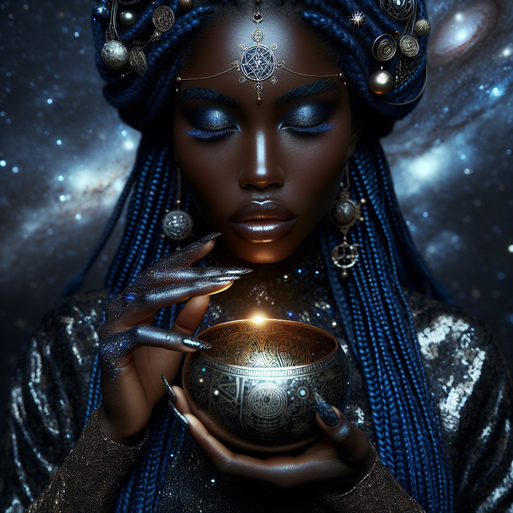 Prompt: An ethereal and captivating image of a mystical figure embodying cosmic wisdom. The subject is a woman with a deep, rich skin tone, exuding an aura of serenity and strength. Her long, flowing hair is a dark blue, styled in intricate braids that cascade down her shoulders. She has a smooth, symmetrical face with almond-shaped eyes, closed in deep contemplation, reflecting hues of silver.