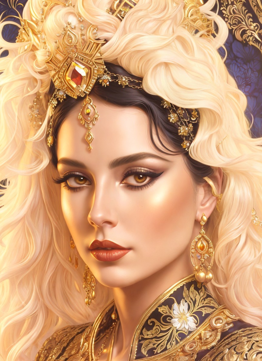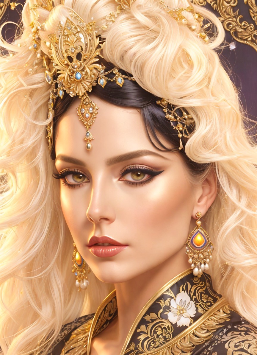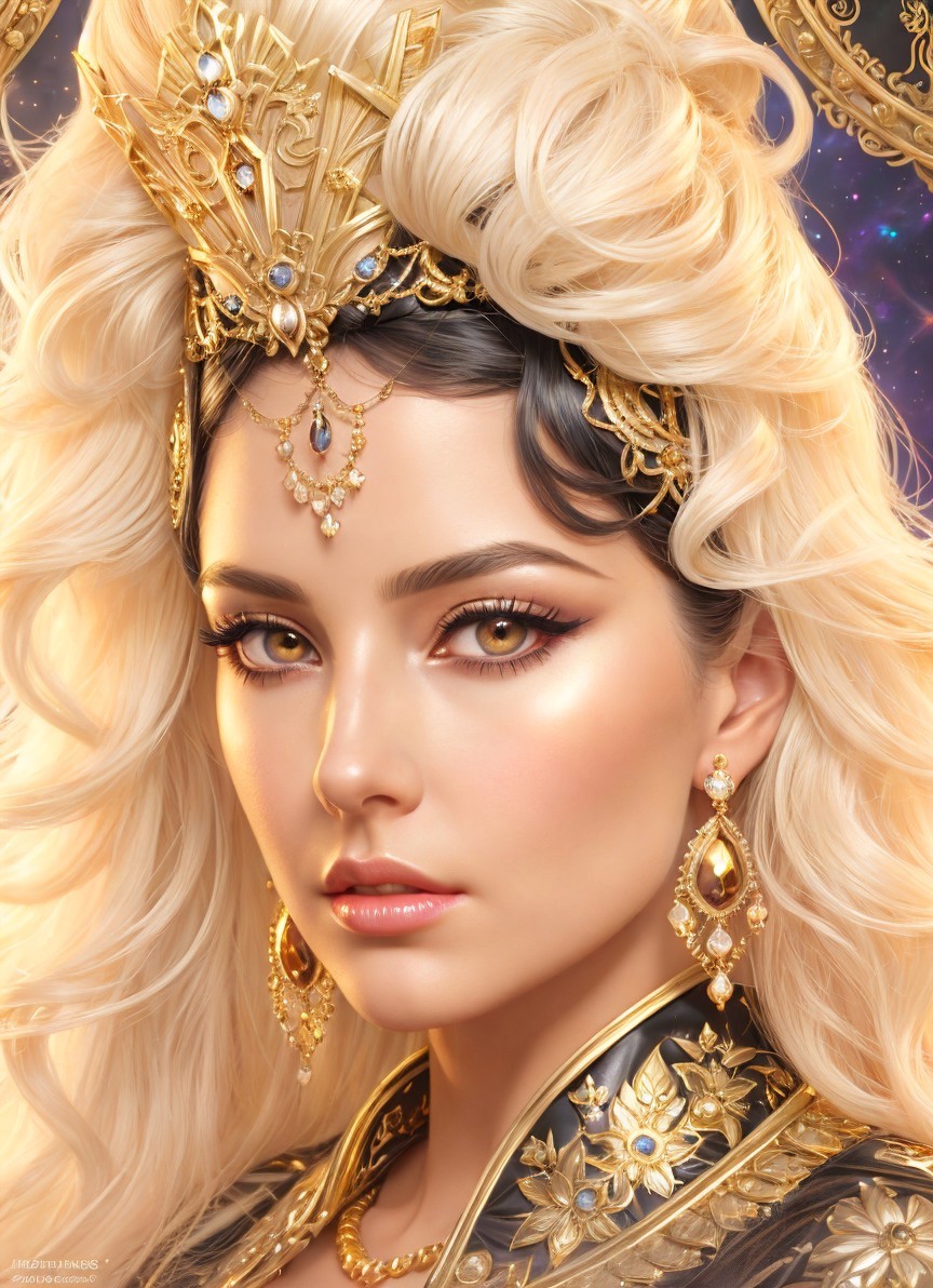 baroque fantasy style painting of a1950s animated female science fiction character, Marvel comic book art, beautiful headshot, close-up, space age style, stacked-up perspective, stylized lineage illustration, style of academical art merged with instaport illustration, style of Georgia O'Keefe, Overton Loyd , Stan lee, Florianne Becker, Margaret Keane, Barbara canepa and Arlie Opal, reddish-brown long hairstyle with hairbangs, plasticity 1.3, complexion 1.4, enlightened, moody, somber attitude, layered geometrical vector art, vaporous illumination, perfect handsface, plasticity 1.3, cel-shaded, muted pastel tones of yellow mauve auburn ,serene, dappled lighting, beautiful blonde fluffy hairstyle with black streaks, Dark Fantasy, upper body portrait, soft rounded edges, sinister, detailed ornamental features with gold lines, american gothic 1.3, tetradic color scheme yellow lilac ochre auburn, ambient occlusion 1.2, octane render illustration, luminosity 1.9, radiance, grey satin blouse with frilly-like details, divisionism, synthetic, fauvistic, muscular, translucent, baroque, cel-shaded, uhd, hdr, ballpen details, traumacore 1.2, octane render illustration, anisotropic filtering 1.7, dynamic lighting 1.7, colored line drawing, style is reminiscent of sketch art, coherent, gradient colors, golden ratio, colorful reflections in style of crayon on textured paper, intricate details, uhd, hdr, crisp quality, anatomically correct, octane render, traumacore 1.9, , gorgeous, perfect handsface, hues, tints of pulp art, overall composition by Georgia o'keffee, , epic essence, alcoholic inkpunk 1.8,