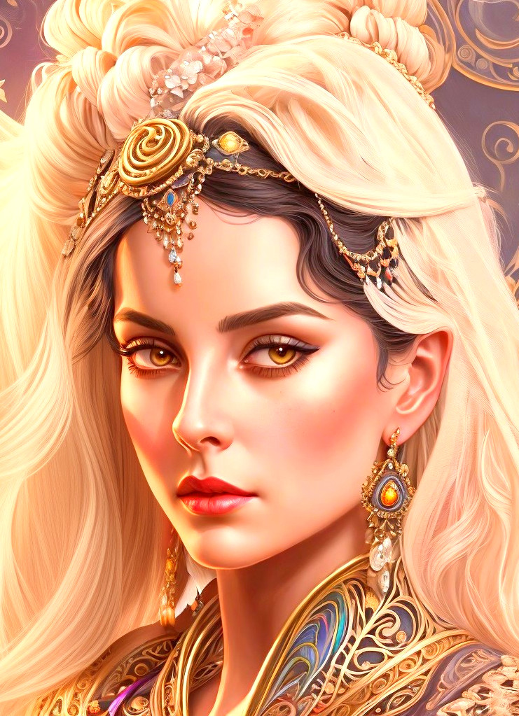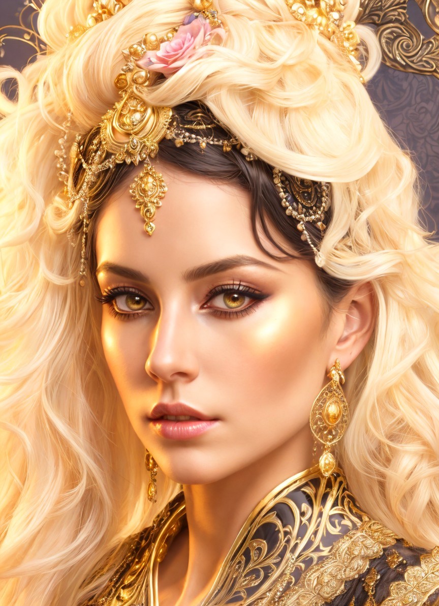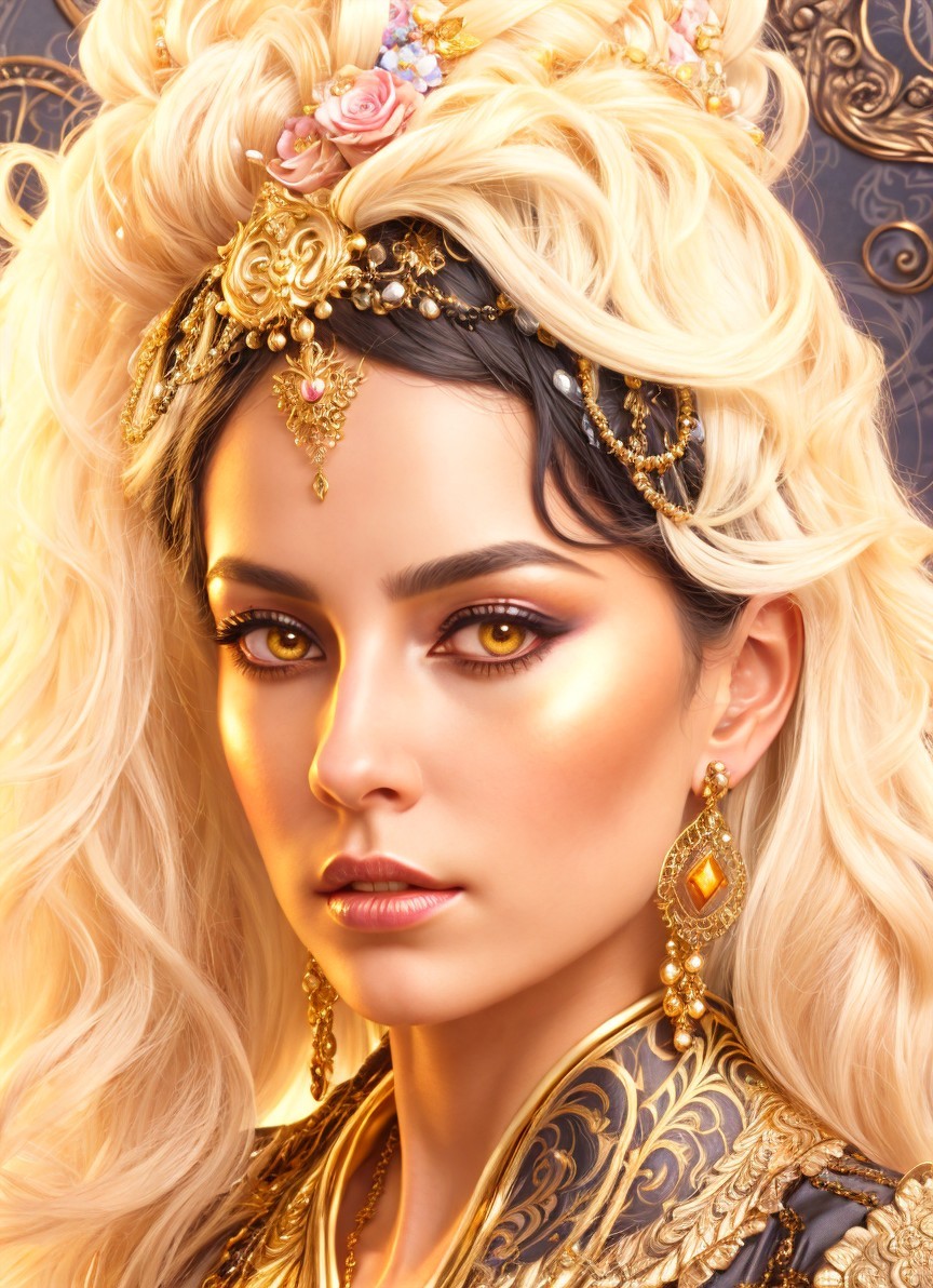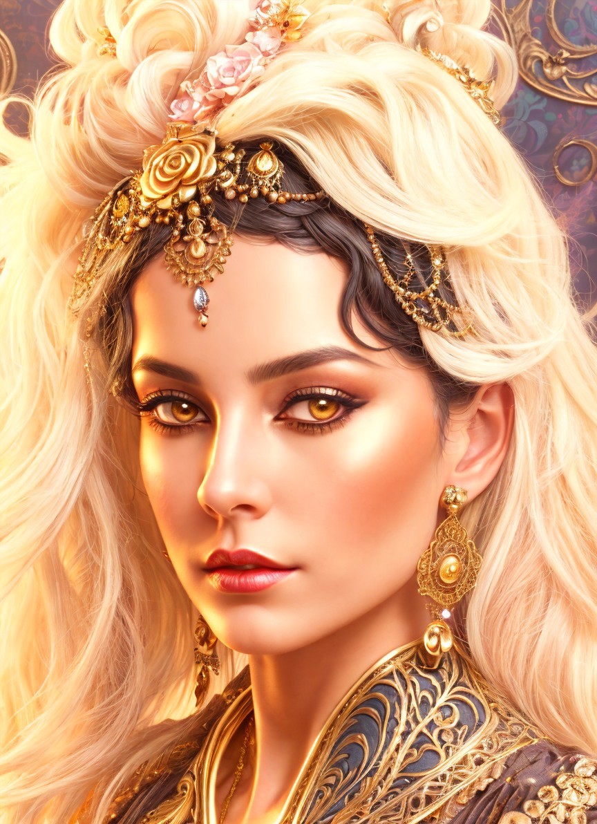 baroque fantasy style painting of a1950s animated female science fiction character, Marvel comic book art, beautiful headshot, close-up, space age style, stacked-up perspective, stylized lineage illustration, style of academical art merged with instaport illustration, style of Georgia O'Keefe, Overton Loyd , Stan lee, Florianne Becker, Margaret Keane, Barbara canepa and Arlie Opal, reddish-brown long hairstyle with hairbangs, plasticity 1.3, complexion 1.4, enlightened, moody, somber attitude, layered geometrical vector art, vaporous illumination, perfect handsface, plasticity 1.3, cel-shaded, muted pastel tones of yellow mauve auburn ,serene, dappled lighting, beautiful blonde fluffy hairstyle with black streaks, Dark Fantasy, upper body portrait, soft rounded edges, sinister, detailed ornamental features with gold lines, american gothic 1.3, tetradic color scheme yellow lilac ochre auburn, ambient occlusion 1.2, octane render illustration, luminosity 1.9, radiance, grey satin blouse with frilly-like details, divisionism, synthetic, fauvistic, muscular, translucent, baroque, cel-shaded, uhd, hdr, ballpen details, traumacore 1.2, octane render illustration, anisotropic filtering 1.7, dynamic lighting 1.7, colored line drawing, style is reminiscent of sketch art, coherent, gradient colors, golden ratio, colorful reflections in style of crayon on textured paper, intricate details, uhd, hdr, crisp quality, anatomically correct, octane render, traumacore 1.9, , gorgeous, perfect handsface, hues, tints of pulp art, overall composition by Georgia o'keffee, , epic essence, alcoholic inkpunk 1.8,