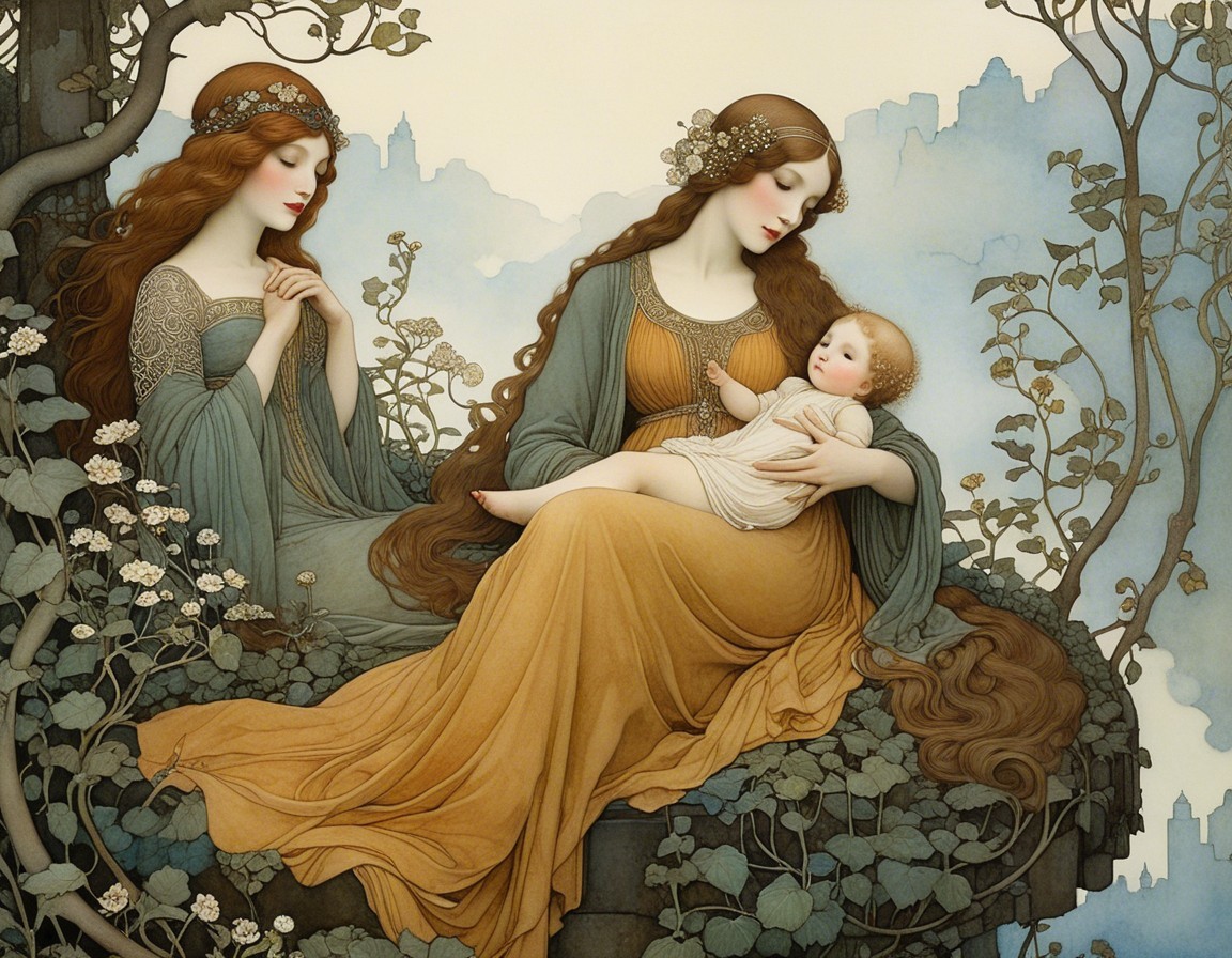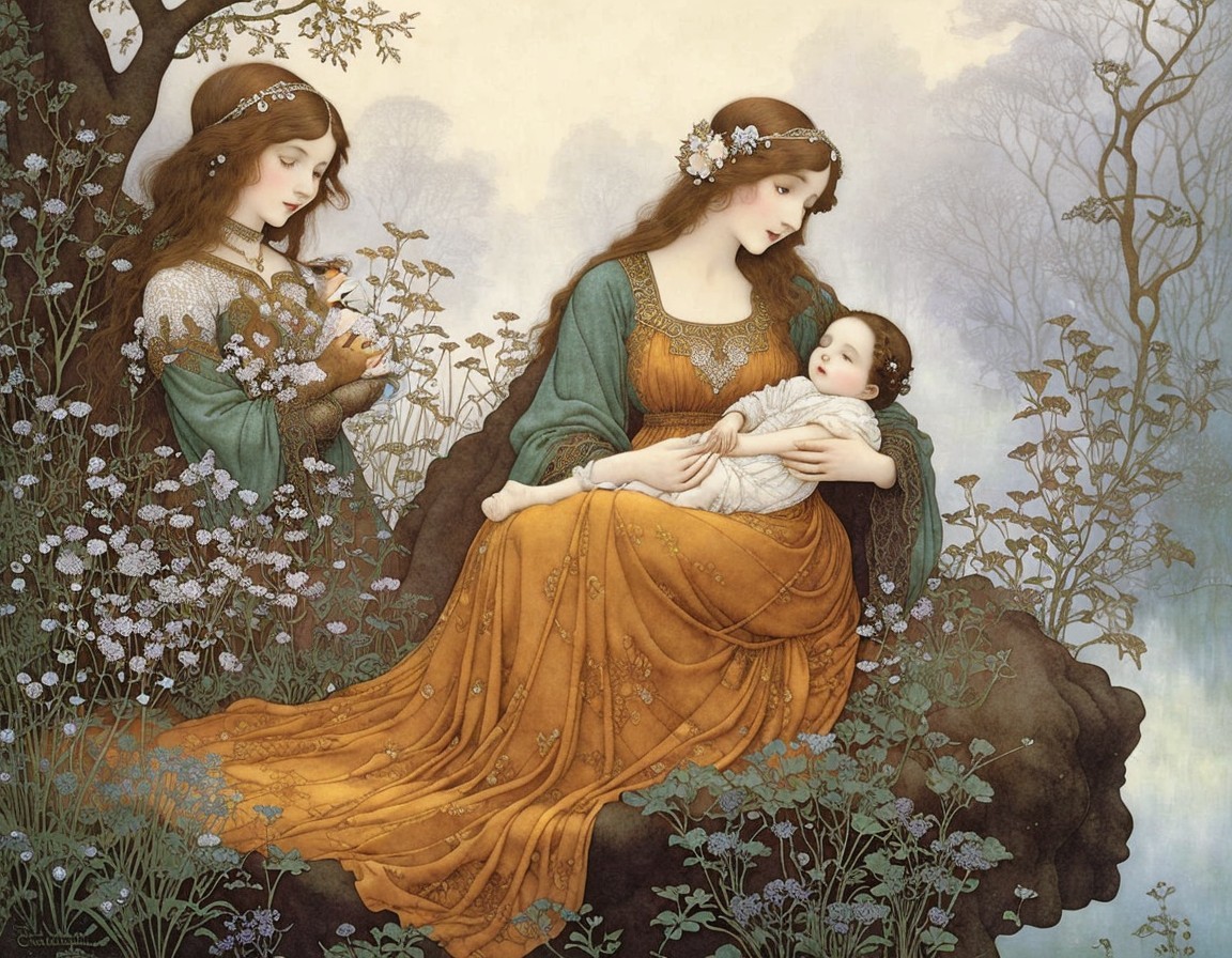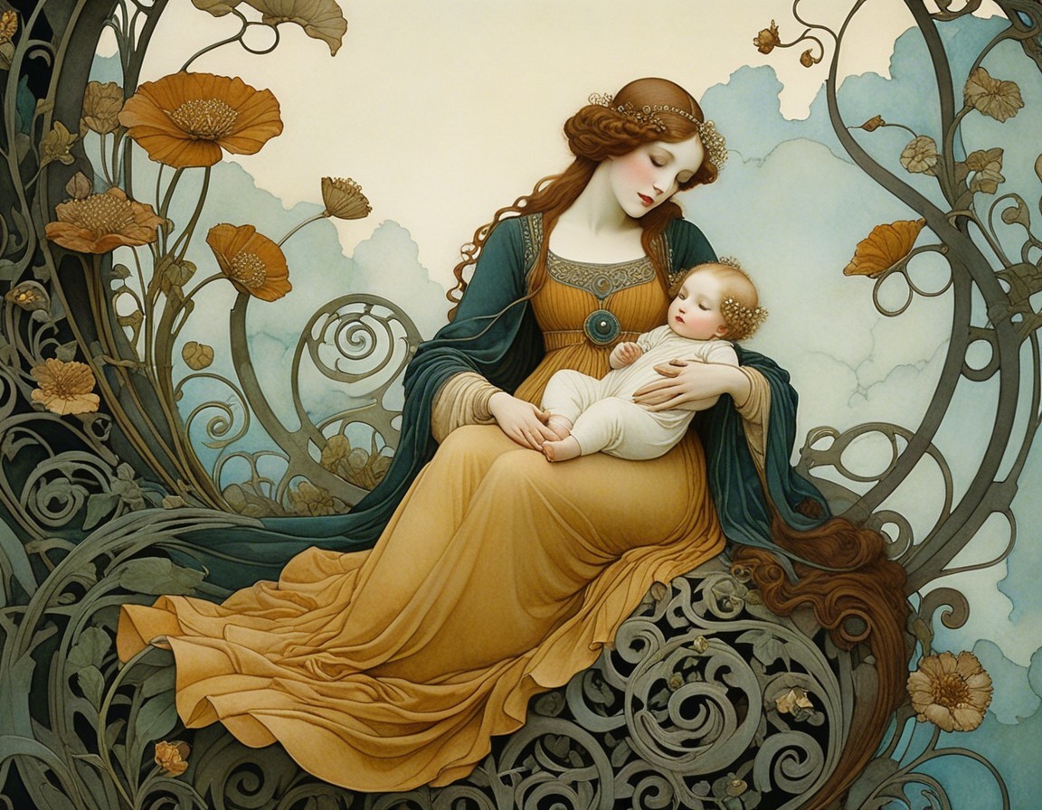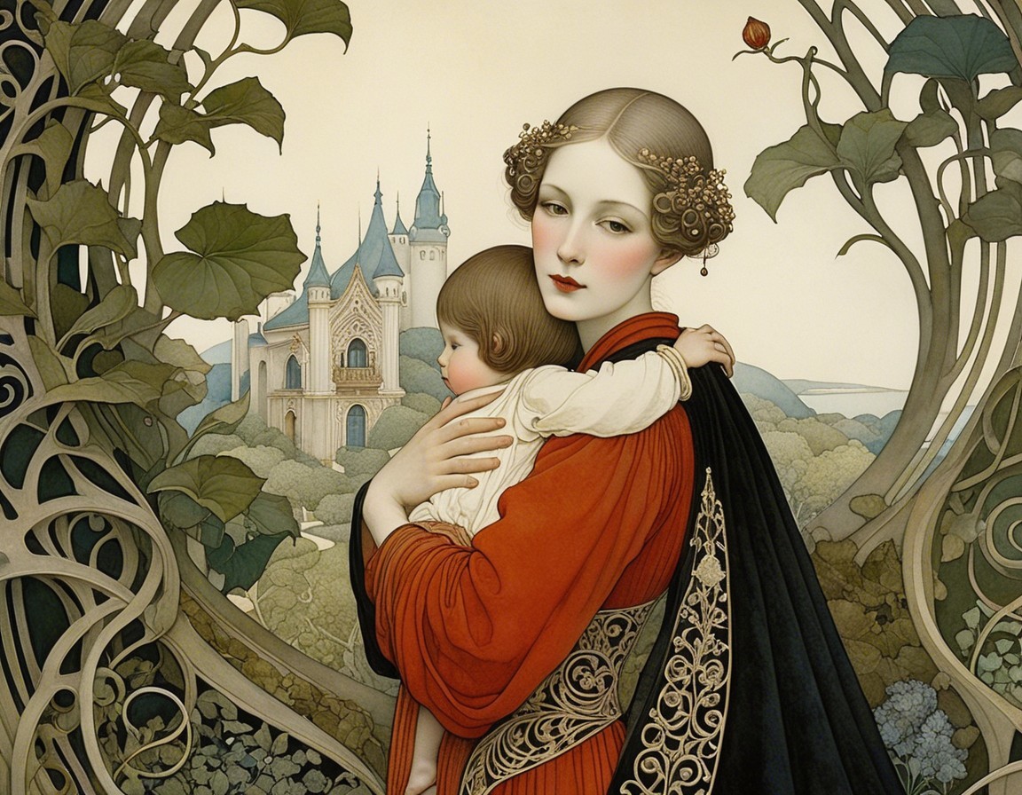 The image features a woman in elegant attire holding a child, both surrounded by intricate floral patterns. The woman's expressive gaze and the gentle embrace create a serene and heartfelt scene.