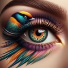 A striking close-up of an eye with vibrant, multicolored makeup. The eye features bright turquoise and orange hues, complemented by sparkling accents and artistic paint splashes around it.