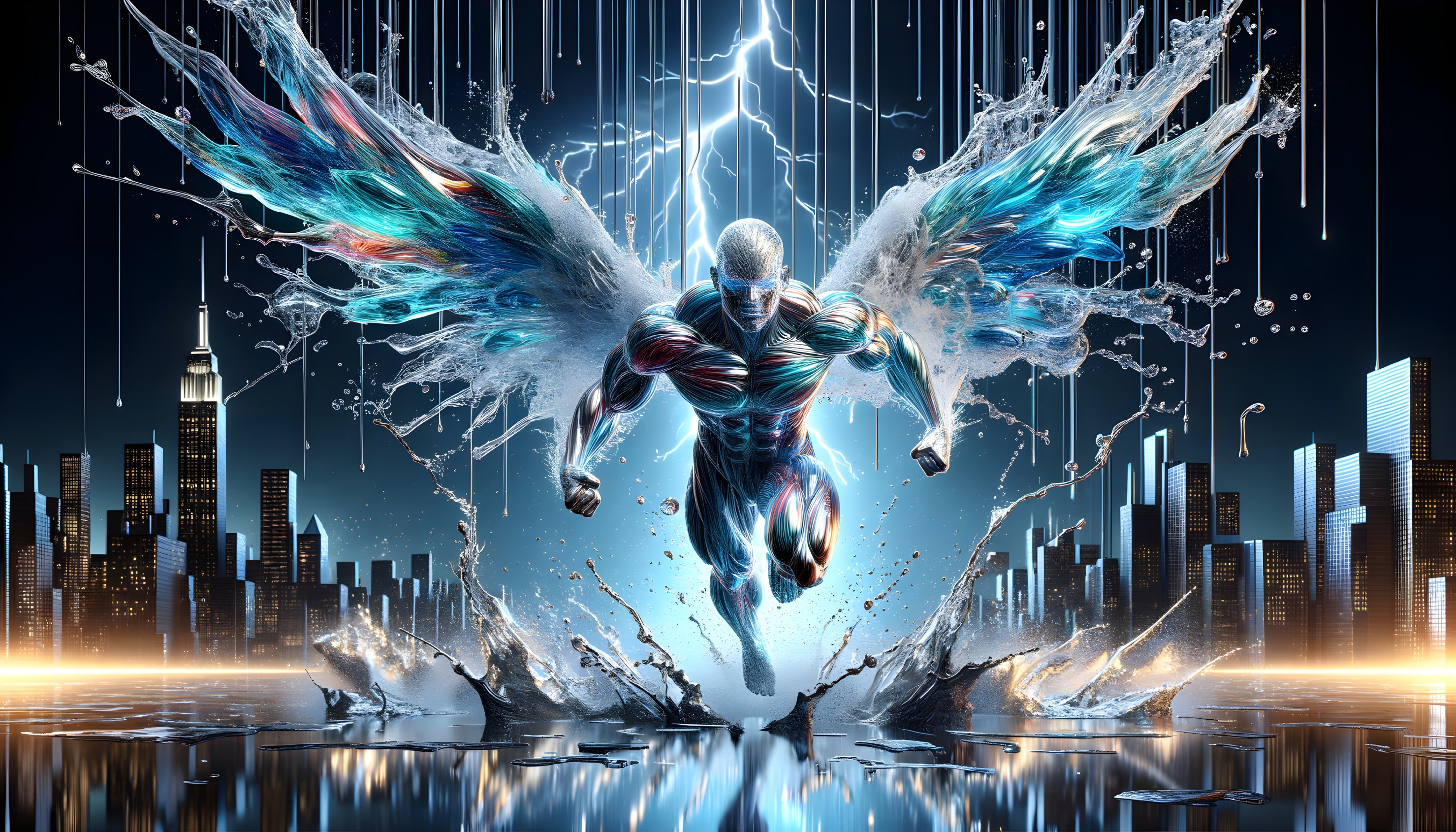 A striking digital artwork of a powerful, winged superhuman bursting from water against a futuristic city skyline with dynamic lightning effects.