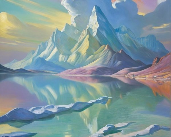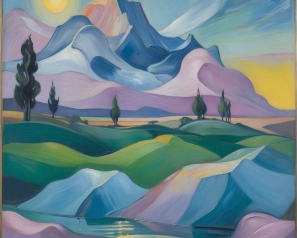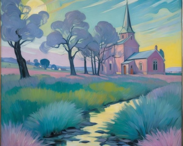 A vibrant painting of a whimsical landscape with pink trees, colorful fields, and a small house atop a hill under a sunset sky.