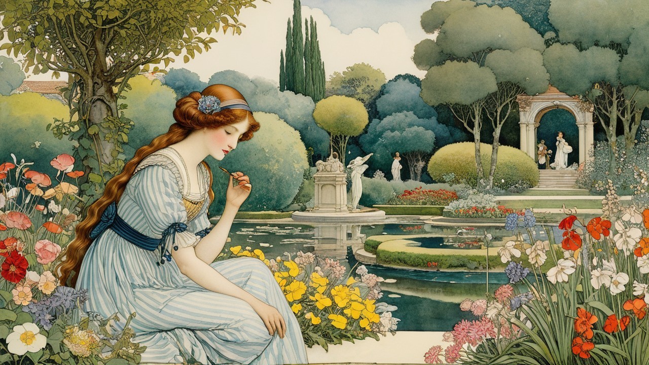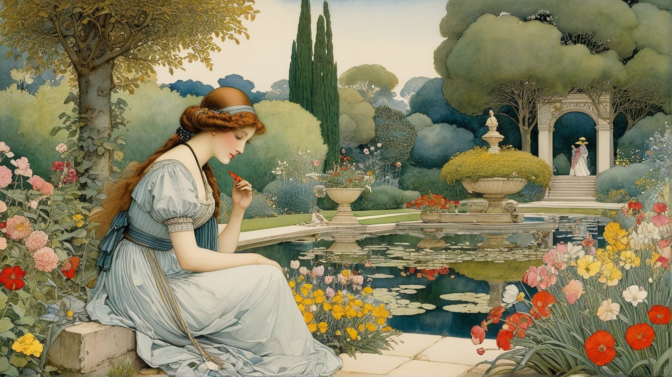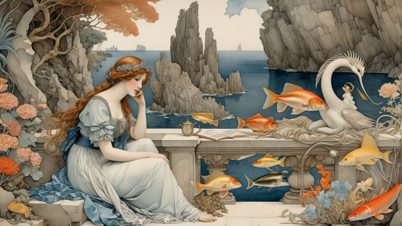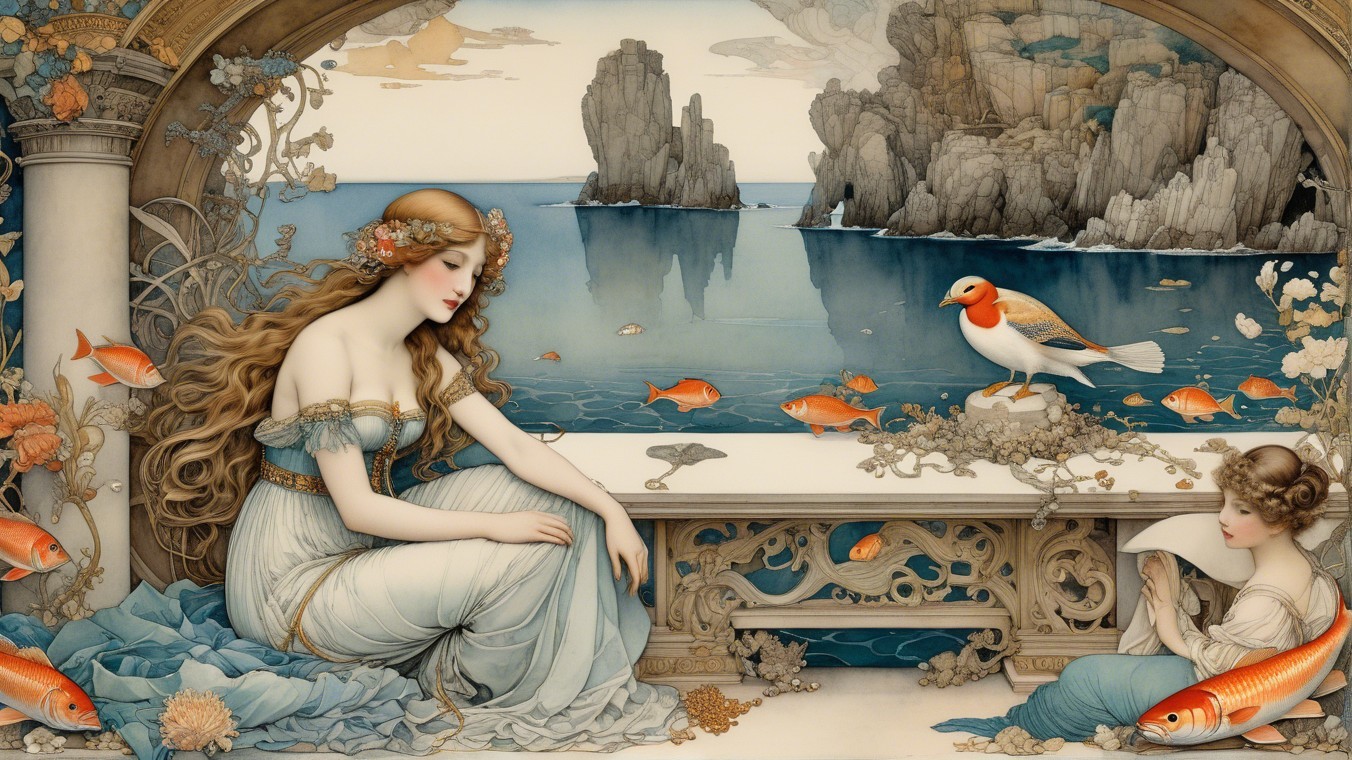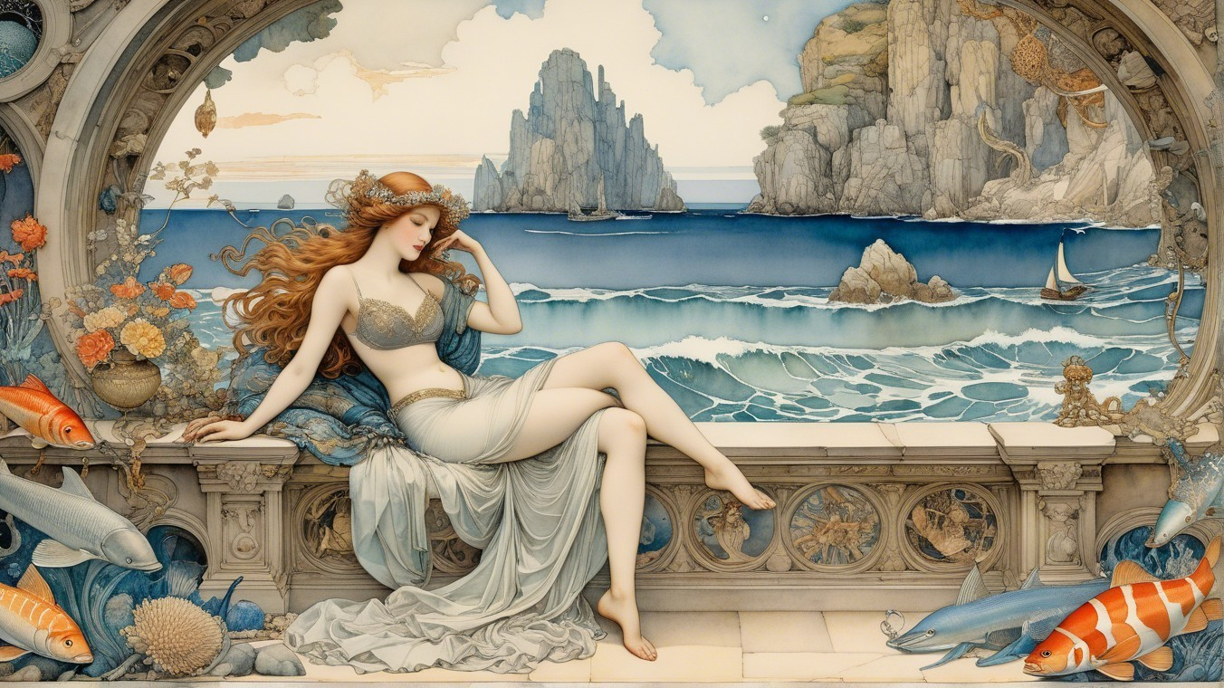 A serene mermaid with flowing hair sits by the ocean, adorned in soft blue, as waves crash against distant rocky shores. A majestic ship sails in the background, enhancing the dreamlike scene.