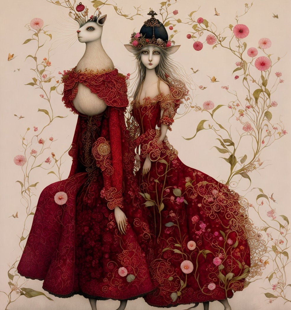 A lady in a lavish red gown adorned with swirling patterns holds a basket of vibrant poppies. Her elegant hairstyle is complemented by a delicate crown, set against a soft, decorative background.