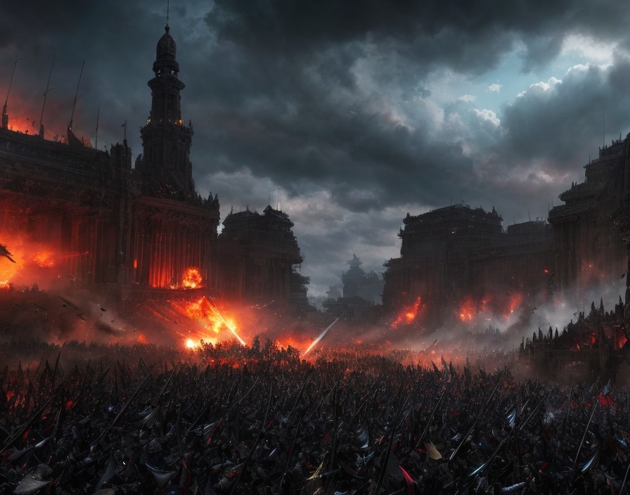 A vast, dark fantasy battlefield with towering gothic structures, armies clashing under a stormy sky, and fires burning amidst the chaos.