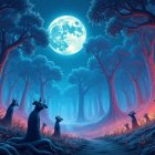 A vibrant forest illuminated by a large moon, featuring colorful trees and luminous foliage. The path winds through the enchanting landscape, creating a magical, serene atmosphere.