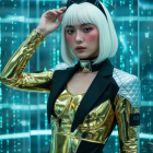 A futuristic figure stands in a sleek, lit environment, wearing a metallic gold outfit with a stylish collar. She has short, wavy blonde hair and headphones, exuding a high-tech vibe.