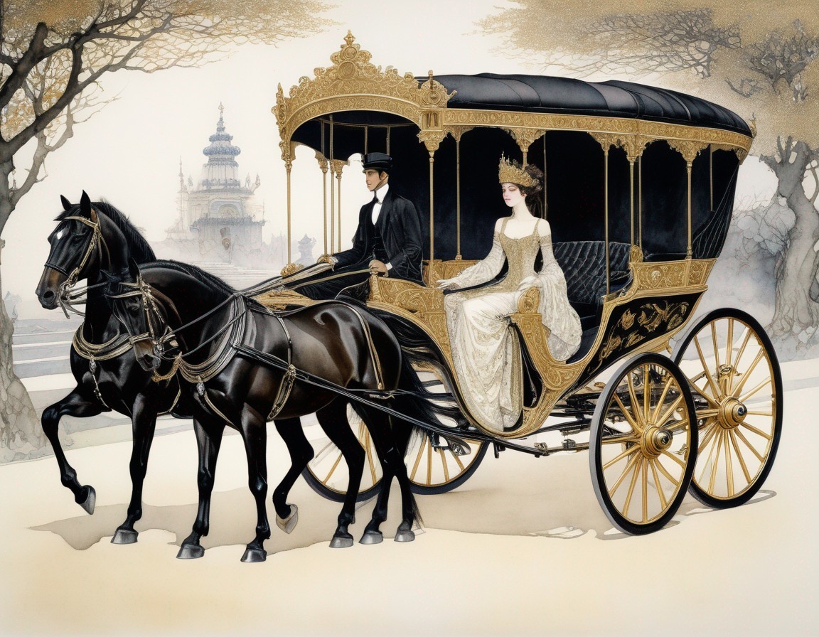 An ornate horse-drawn carriage with two black horses and passengers in historical attire rides amidst autumnal trees.