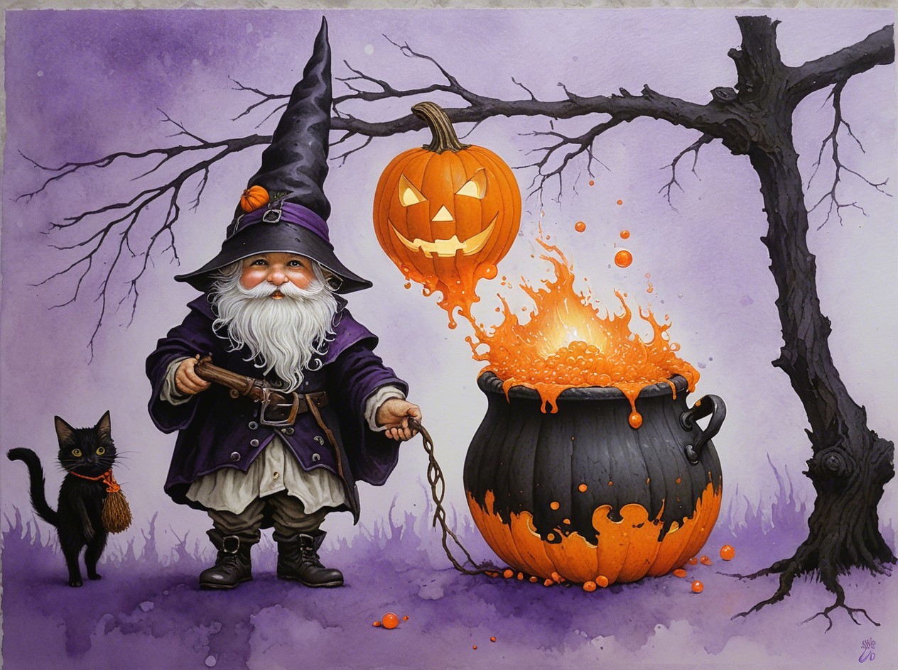 A whimsical gnome in a black witch's outfit and a bubbling cauldron. A glowing pumpkin hangs above, while a curious black cat watches on a spooky, purple background.