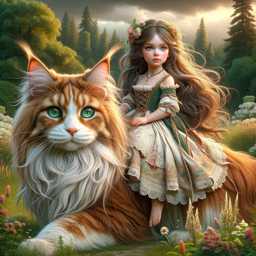A young girl in a vintage dress with a floral crown sitting on a majestic long-haired cat in a lush, green landscape with a castle in the background.