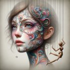 A stunning portrait of a woman with vibrant, artistic face paint and swirling hair accessories, showcasing intricate designs in vivid colors, highlighted by her striking eyes and soft makeup.
