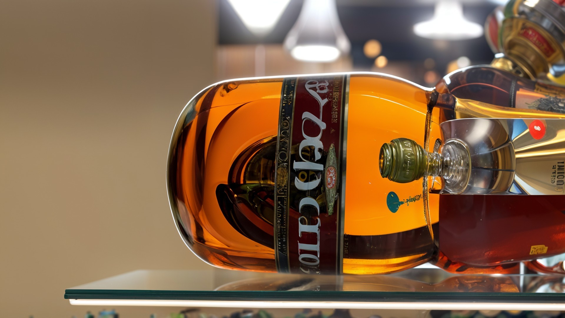 A beautifully designed bottle of Brandy with an intricate label, featuring a rich amber color. Blurred bottles in the background add a warm, inviting ambiance to the setting.