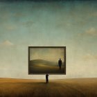 A surreal landscape features a lone figure standing atop a large, colorful block formation resembling a tree. Soft clouds drift in the sky above a golden field, creating a dreamlike atmosphere.
