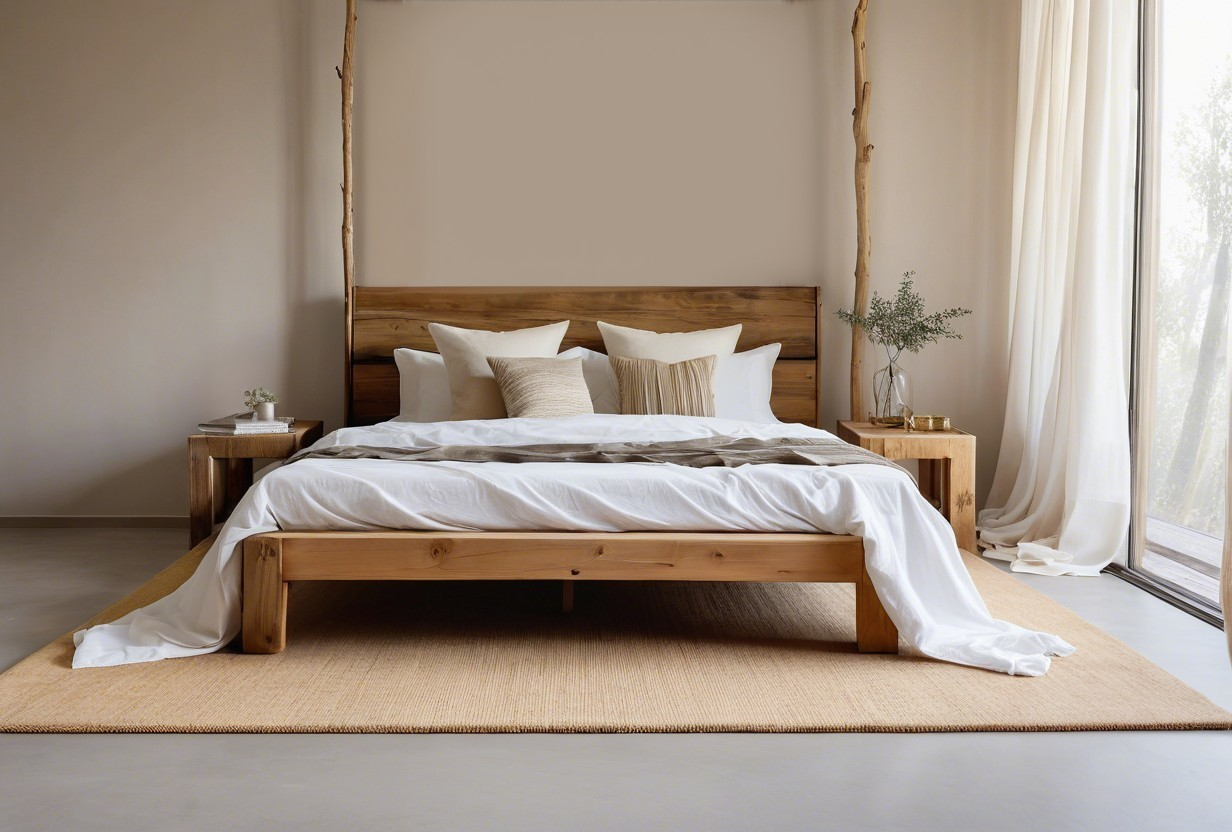 A serene bedroom featuring a wooden bed frame with white bedding, accented by neutral pillows. Natural light floods the space through sheer curtains, complemented by rustic bedside tables.