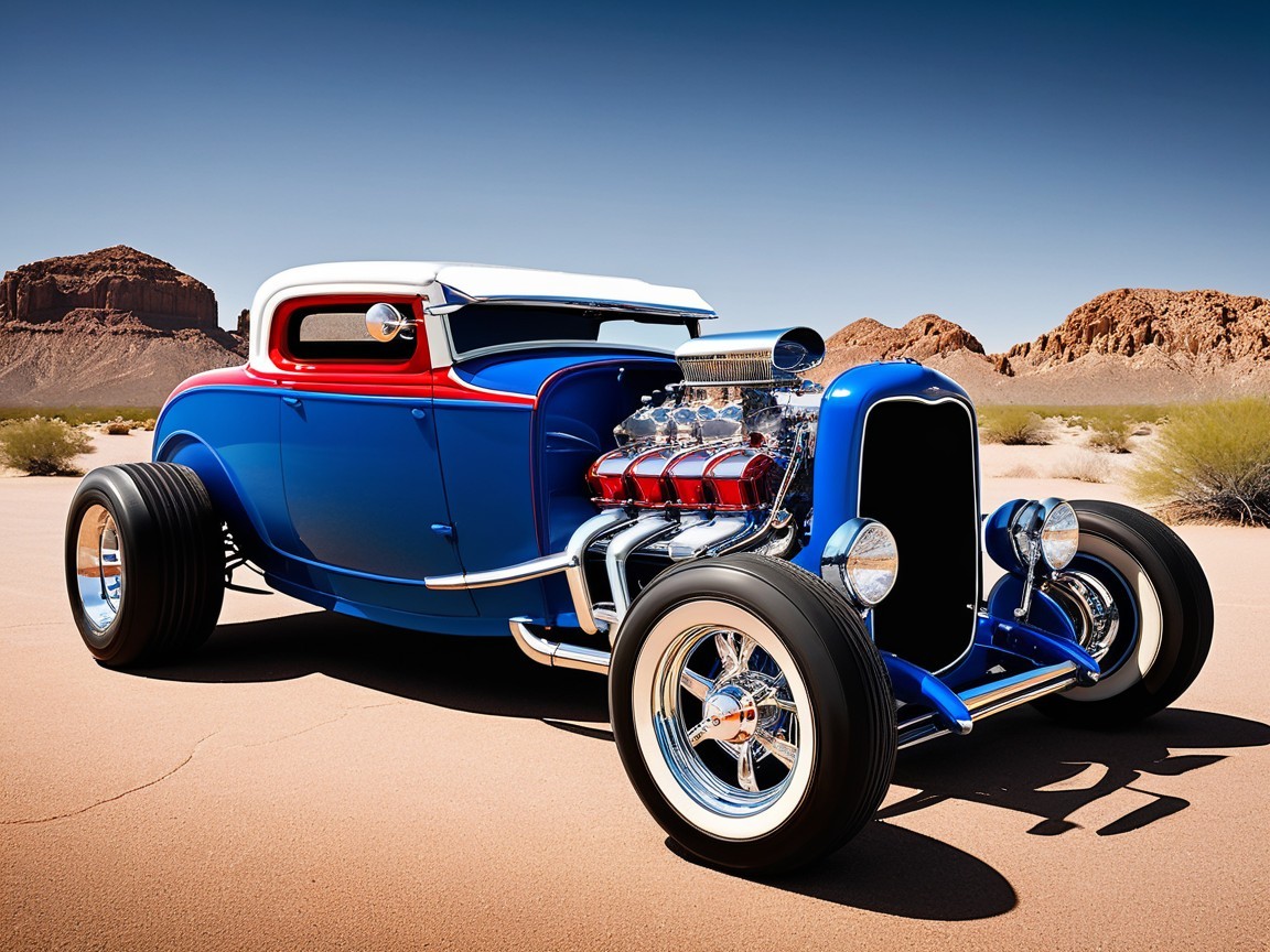 This vibrant vintage car features a striking blue paint job with red accents. Its sleek design and exposed engine highlight a classic hot rod style, set against a scenic desert backdrop.