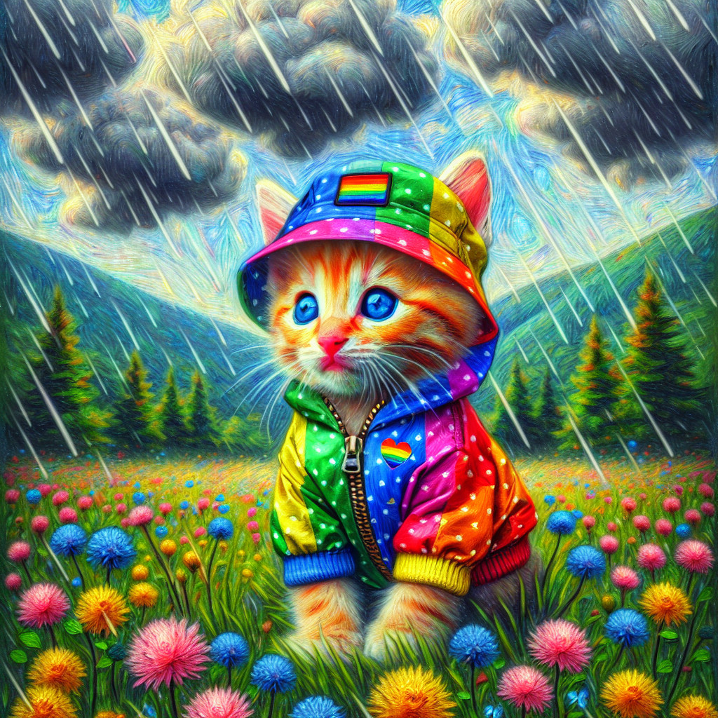 A charming orange kitten wearing a vibrant rainbow raincoat sits in a colorful flower-filled meadow under a cloudy sky, with raindrops gently falling around it.