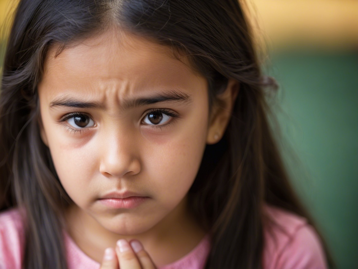 A young girl with long, dark hair has a melancholy expression, her large brown eyes reflecting sadness. A softly blurred background adds depth to the image.
