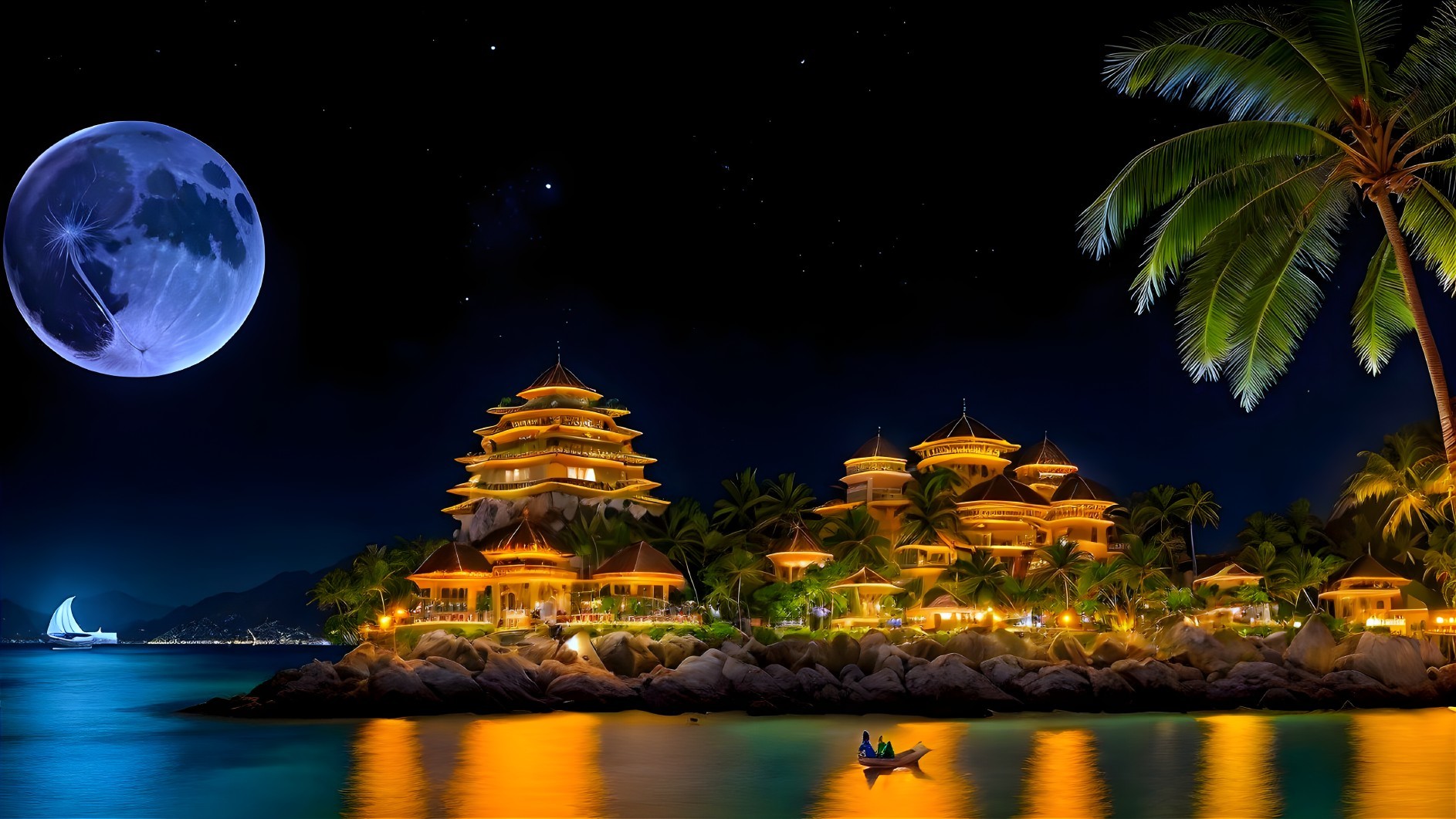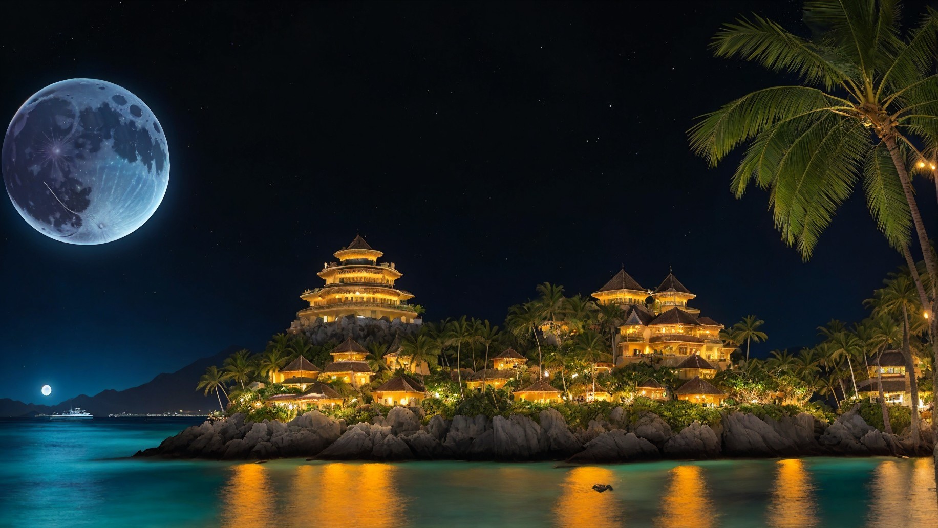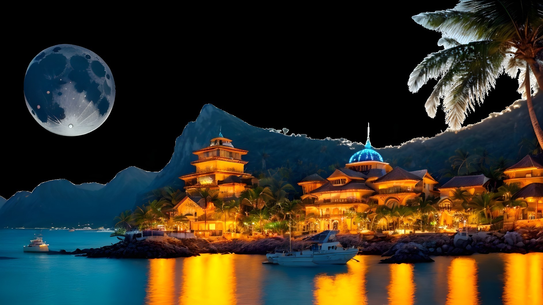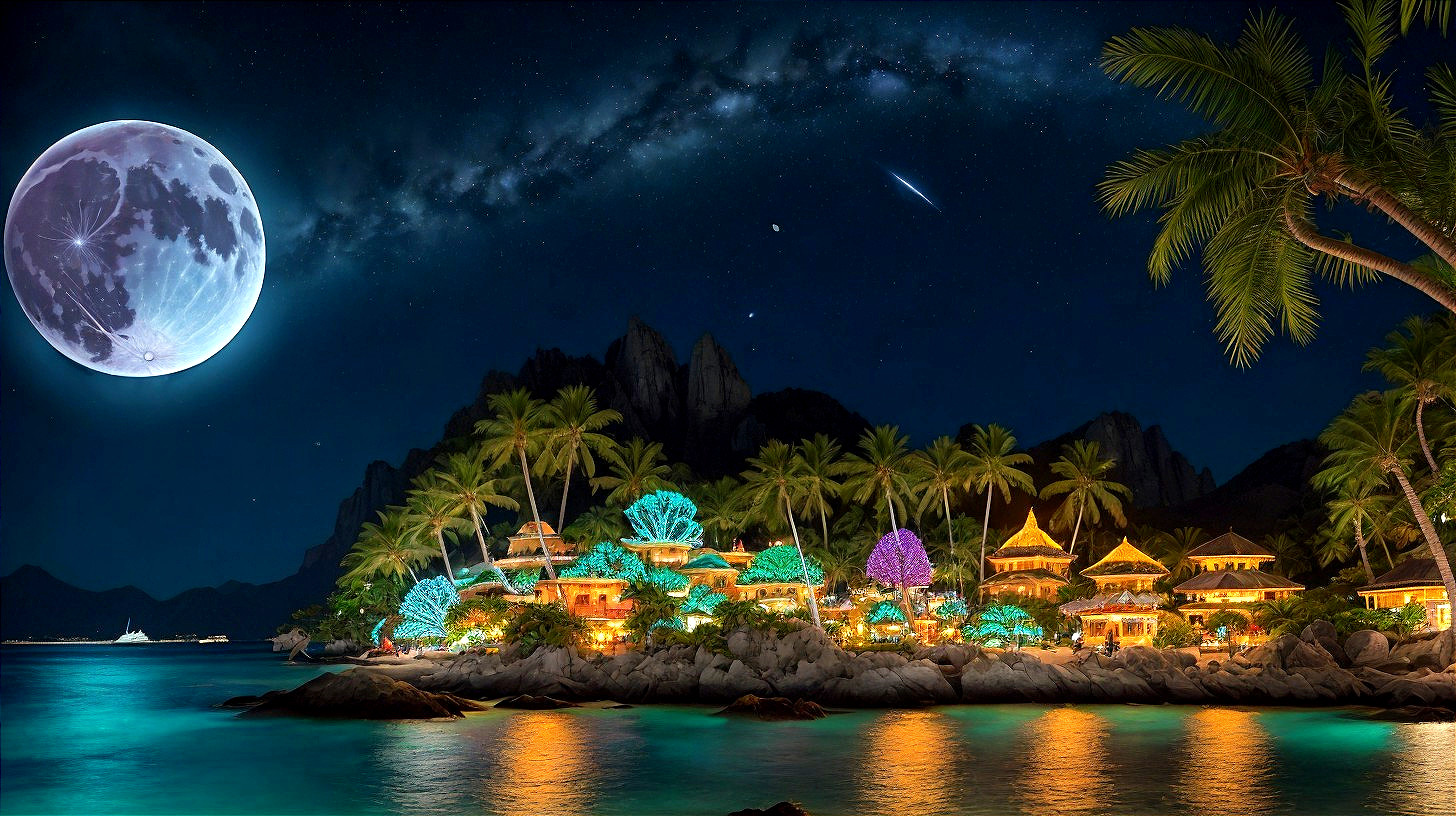 An island town surrounded by mountain range, at midnight the town is illuminated by a huge azure colored moon, the Milky Way is glowing in the sky, divers dive from a yachts, coconut palms are beautifully planted along the beach