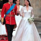 The image captures a joyful moment of a couple in formal attire. Prince William, in a military uniform, and Kate Middleton, now a princess, in an elegant wedding dress and veil, hold hands, radiating happiness.