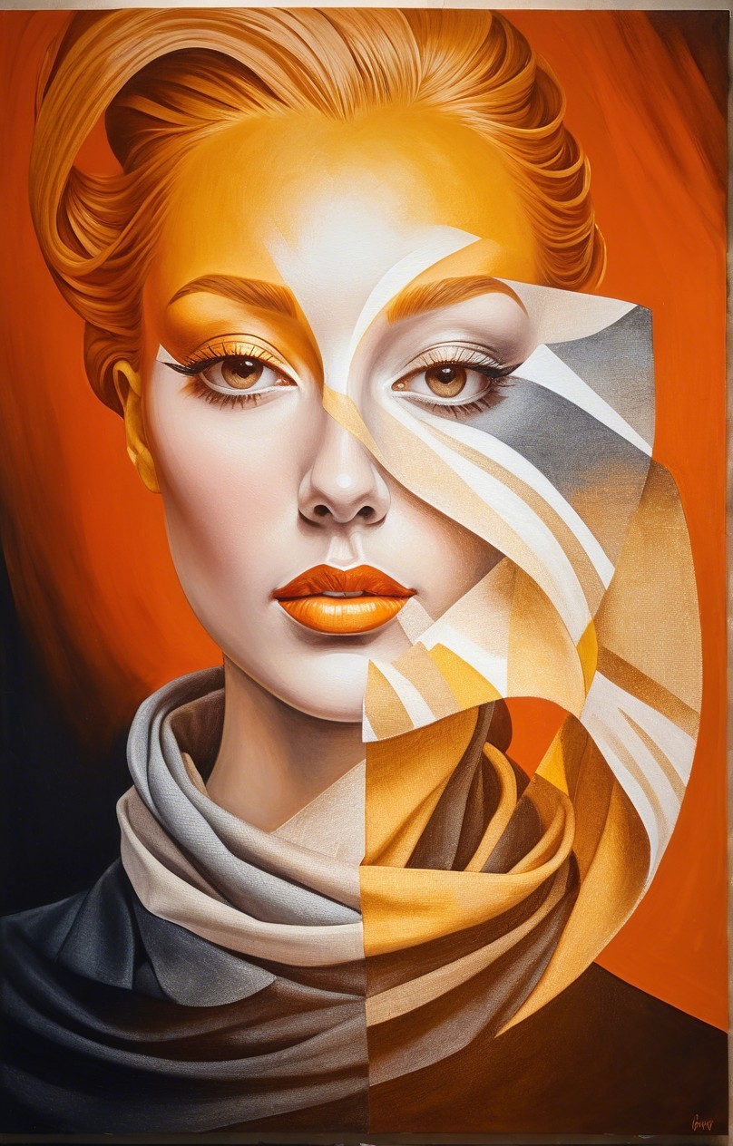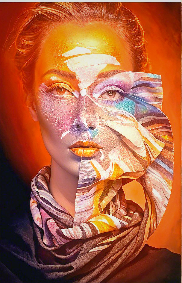 A striking portrait featuring a stylized woman with bold makeup and a partially abstract face. Vibrant orange and black hues create a dynamic contrast, enhancing the artistic expression.