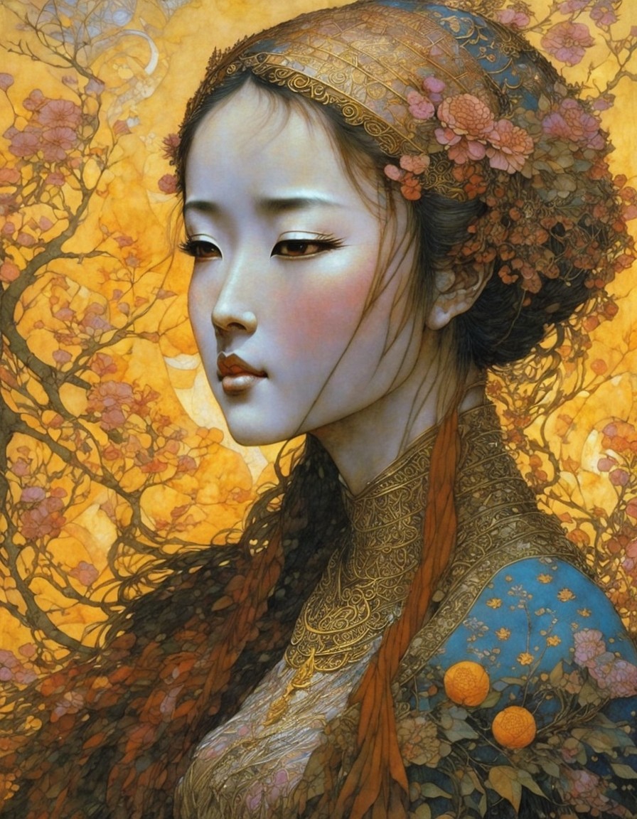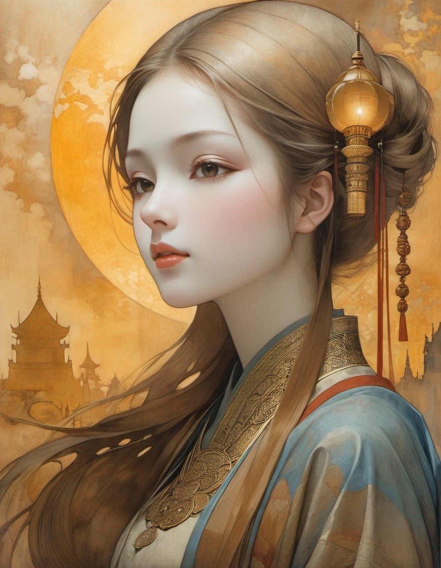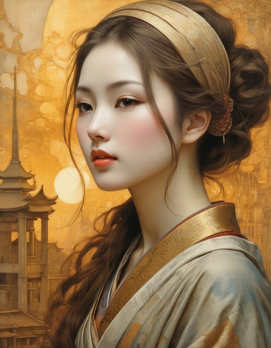 An artistic portrayal of a woman with traditional East Asian features, a pagoda in the background, showcasing cultural elegance.