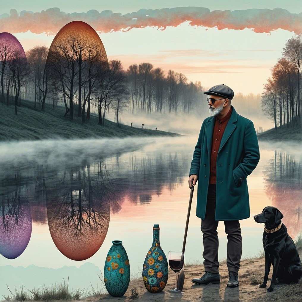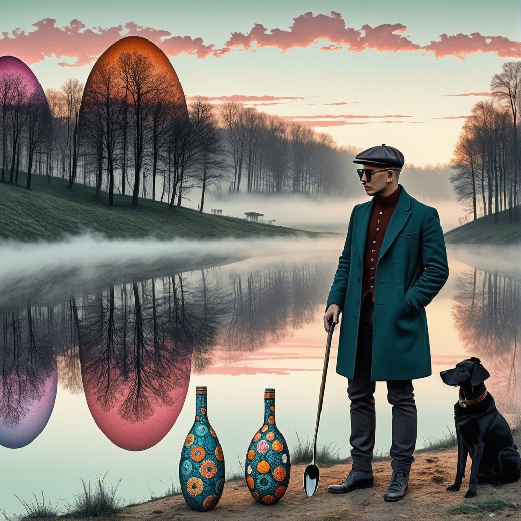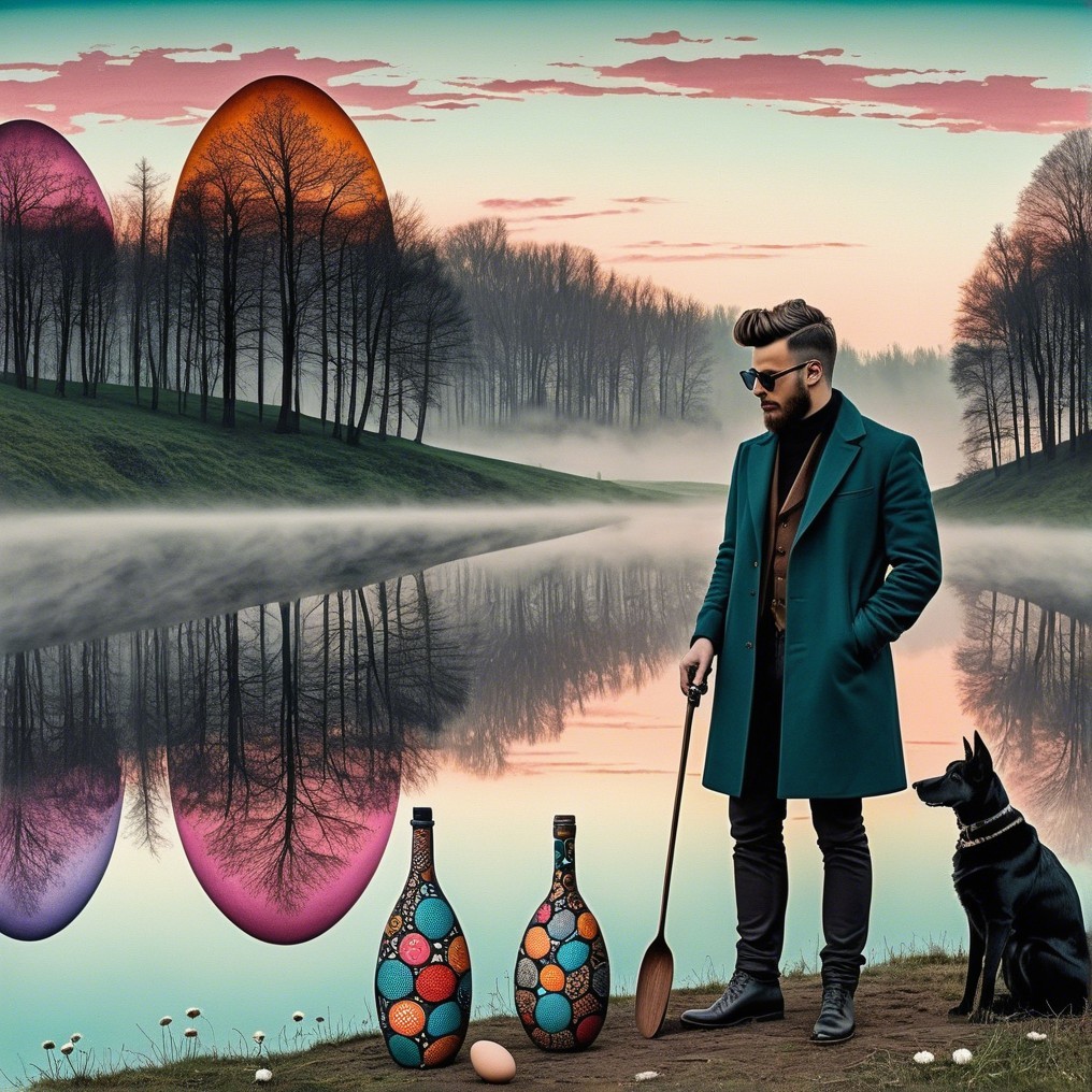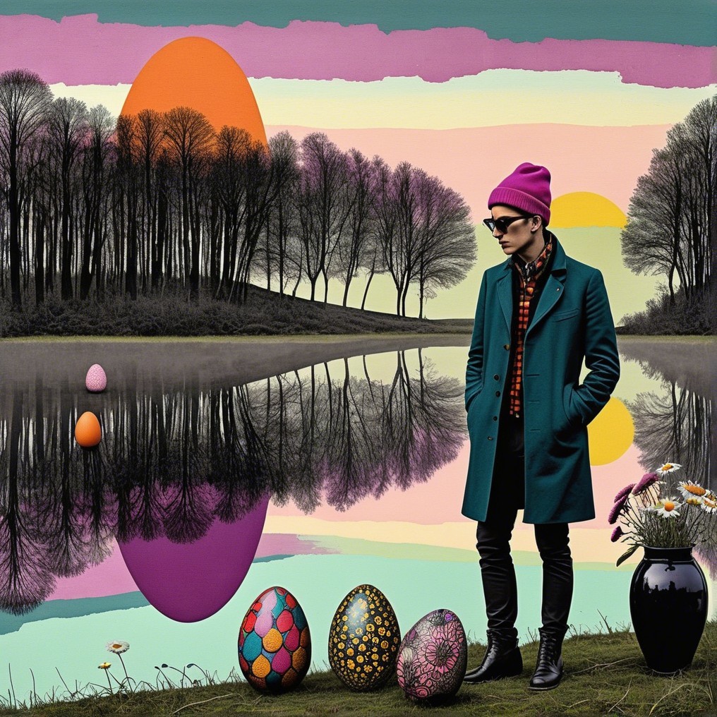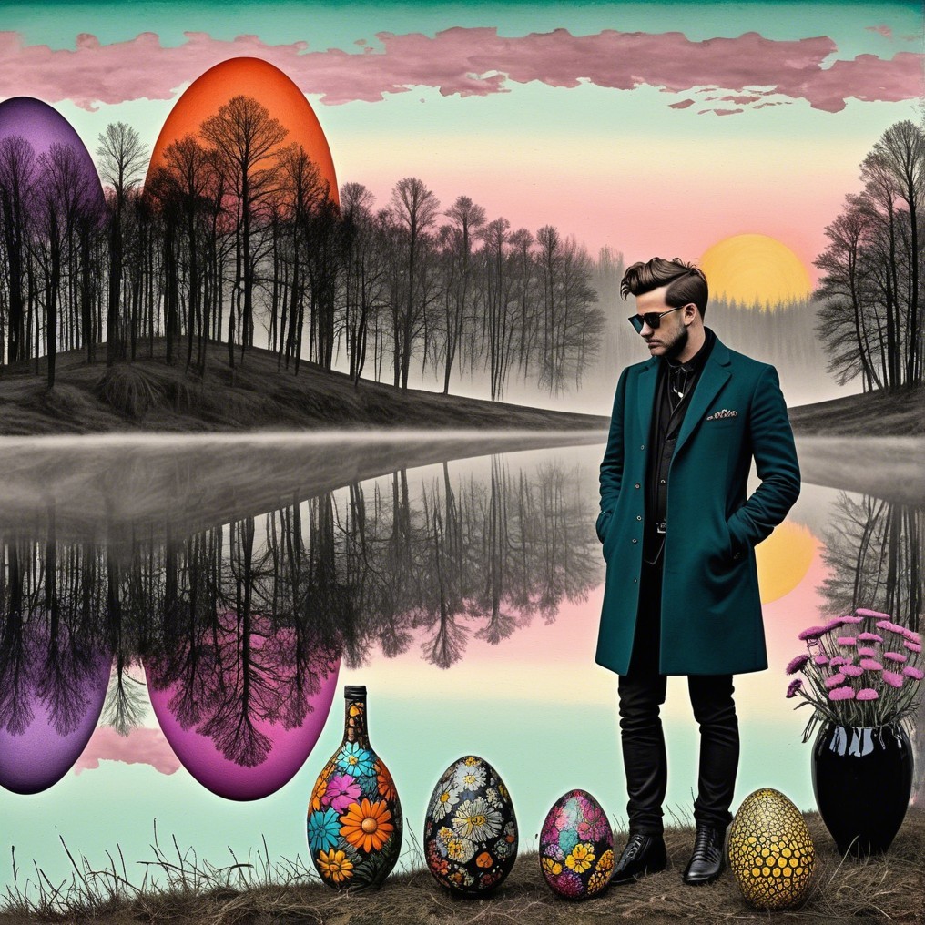A solitary dandy in teal stands at a quiet riverbank where pastel sunsets weep over giant painted eggs, relics of forgotten quests. Bare trees mirror in still waters, and a soft melancholy breathes through the dreamlike landscape.