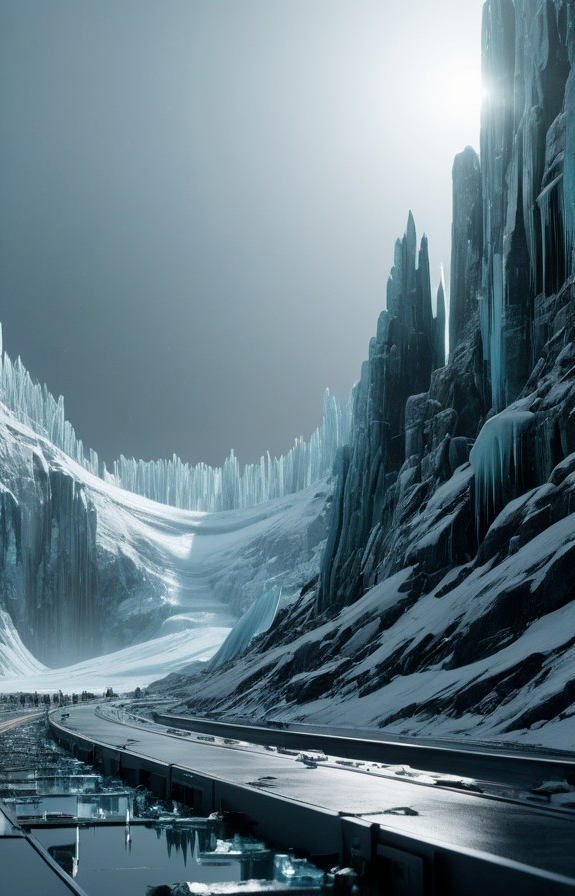 A serene, icy landscape features towering, jagged ice formations and glaciers under a softly glowing sky, reflecting shimmering light on a tranquil, winding waterway.