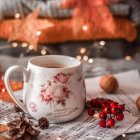 A cozy scene featuring a floral-patterned cup of tea surrounded by walnuts, pine cones, autumn leaves, and music sheets, all softly illuminated by warm, twinkling lights.