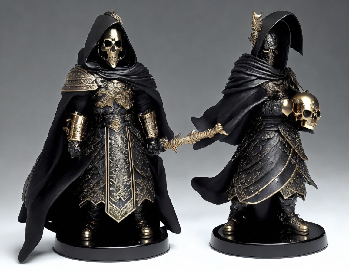Two intricately designed figurines stand side by side, dressed in dark cloaks and armor, featuring skull motifs. One holds a sword, while the other strikes a confident pose.