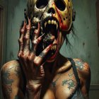 A fierce, stylish character with dramatic face paint and tattoos, showcasing intense expression. The setting appears dark and mysterious, with a hint of magic as she holds a flame.
