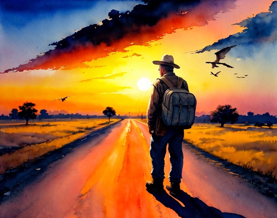 A traveler stands on a sunset-lit road amid a scenic landscape, contemplating the journey ahead. Birds fly overhead in a vibrant sky.
