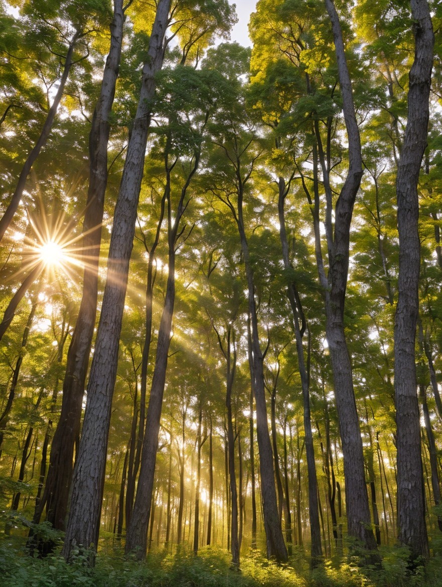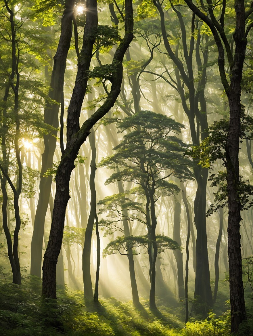 Sunlight filters through a misty green forest, casting beams of light between tall, leafy trees, creating a serene and mystical atmosphere.