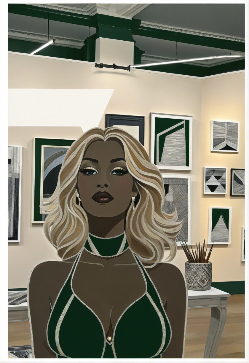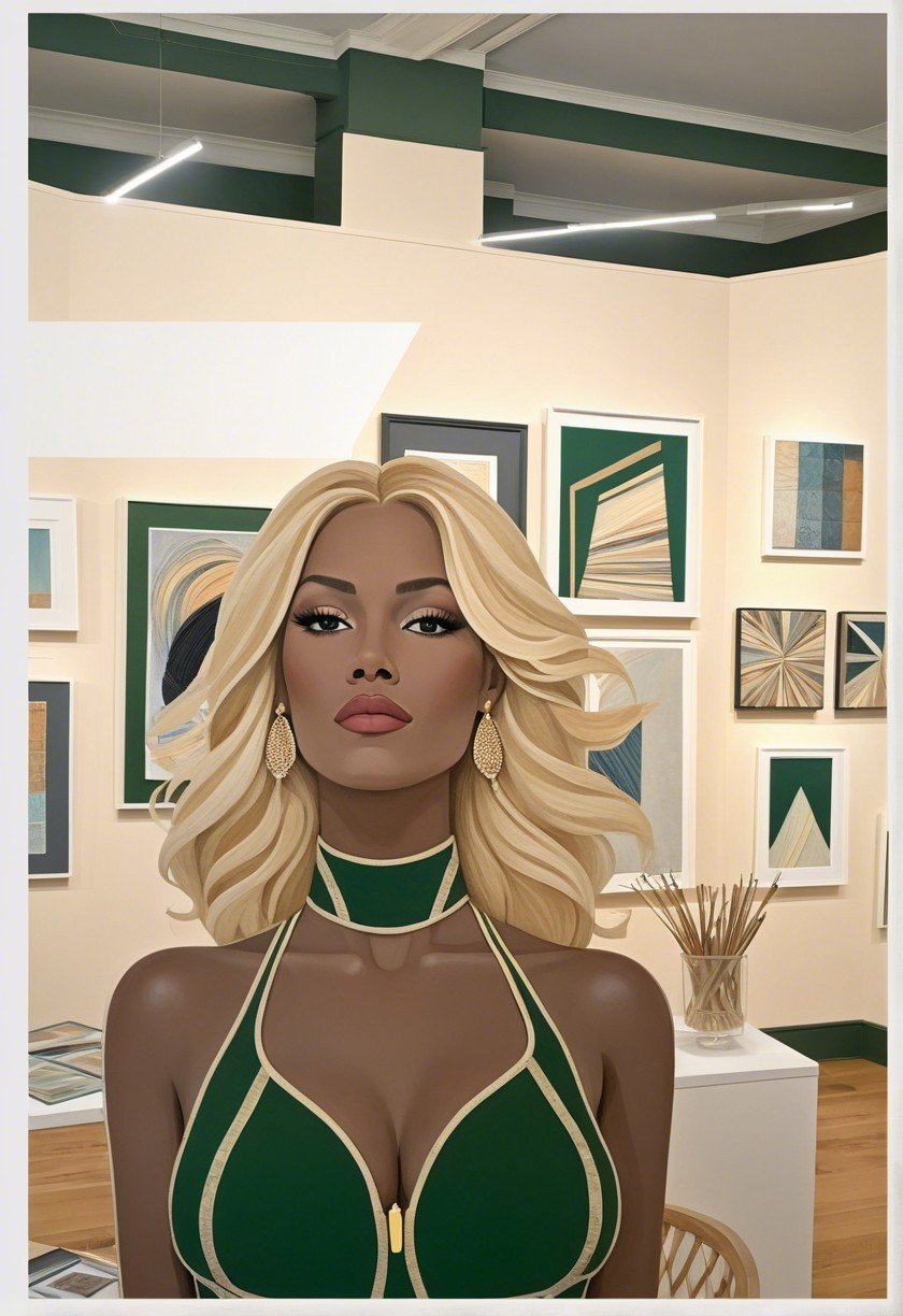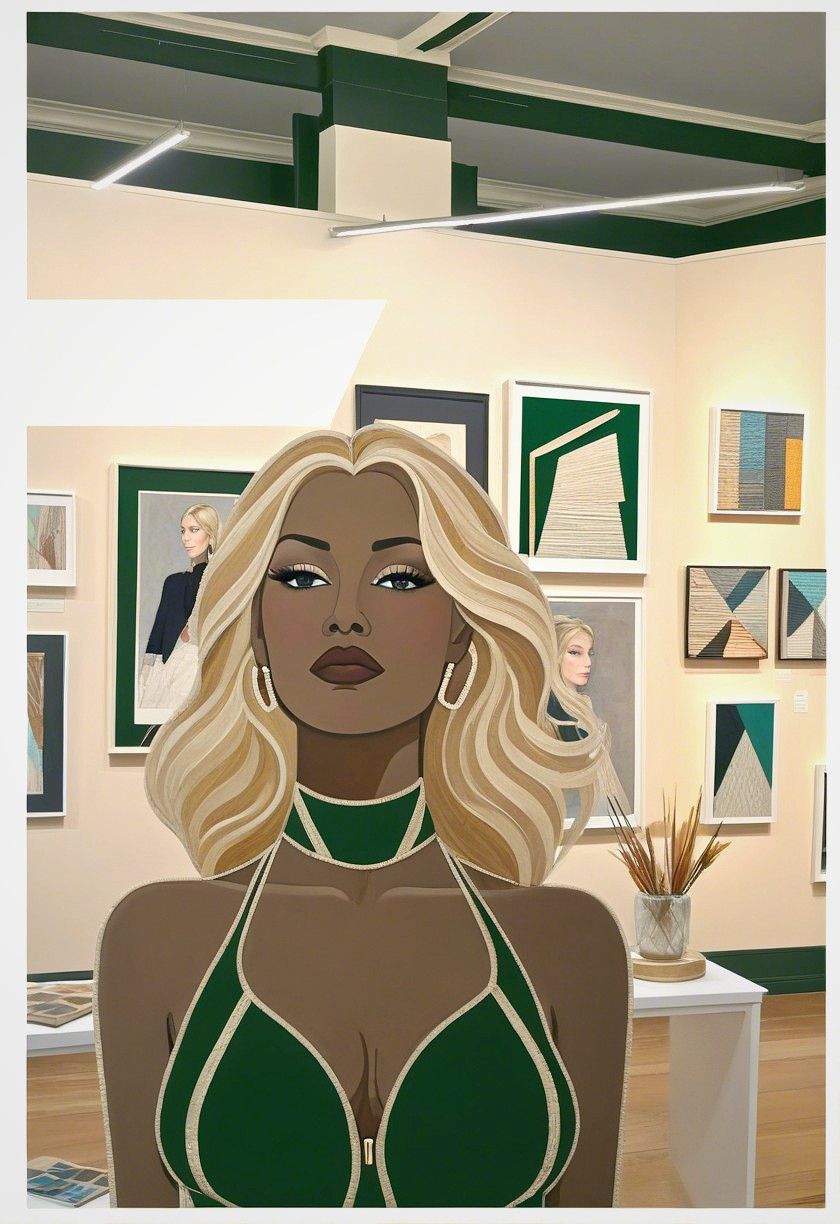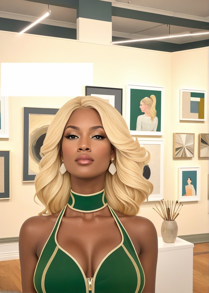 A stylish figure with long, wavy blonde hair poses in an art gallery, wearing a green outfit. Abstract artworks and framed images adorn the walls, creating a sophisticated ambiance.