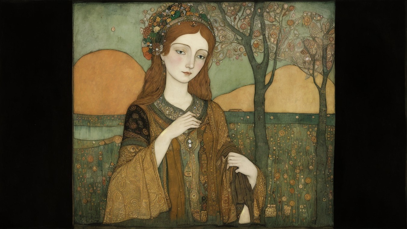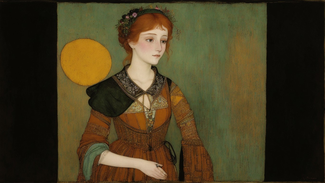 Beautiful girl's portrait in ochre, garden, Copper oxidation patina, Art Brut, moody, somber, desaturated colors, in the style of Paul Klee, Arthur Rackham, Banksy