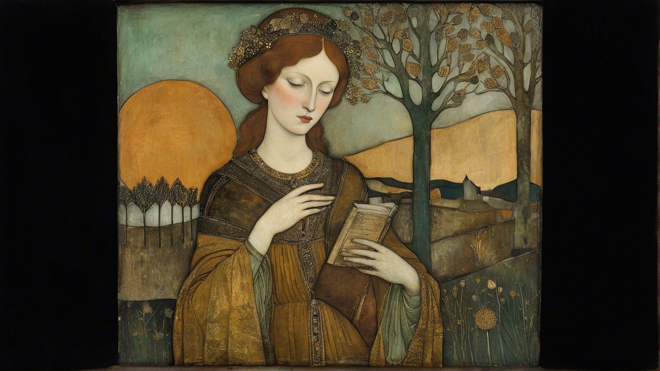 Her portrait. She's an illuminated manuscript that I can't see, in whisky, ochre and verdigris, lost in thoughts that aren't of me, looking down, art brut, somber, desaturated colors, mercury glass patina, Lebanon, in the style of Arthur Rackham, Paul Klee, Gustav Klimt, Honore Daumier
