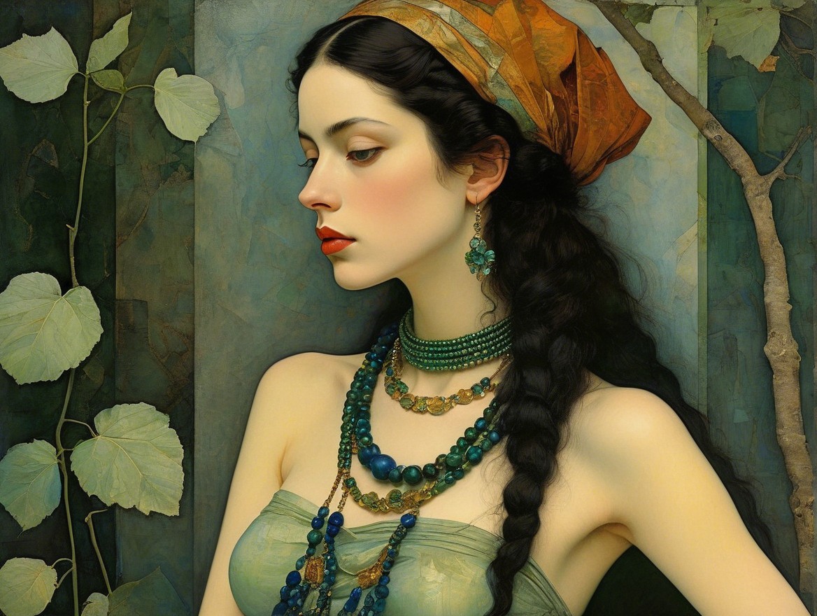 An artistic depiction of a woman with an orange headwrap, green dress, and blue jewelry, against a backdrop of green and gold circles.