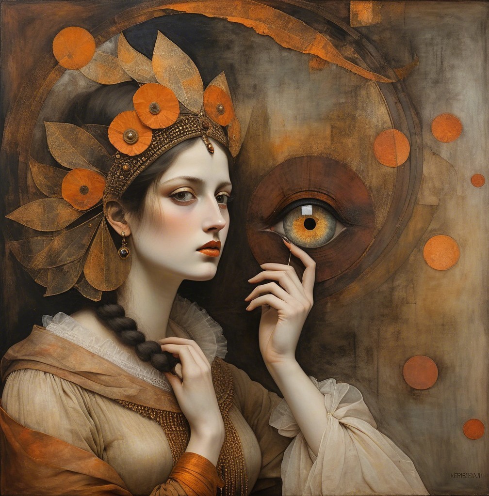 + Prompt:Emerging chrysalis. foggy nostalgia, portrait in Burnt umber and salmon gold, smoke and mirrors, patina of, battery acid, art brut, moody, somber, desaturated colors, in the style of Paul Klee, Arthur Rackham Dark and moody oil painting of a woman with piercing black eyes, inspired by the works of John Singer Sargent and Edgar Degas, long shot, realistic texture, dramatic lighting, intricate details on clothing and Magical woman fading tones of melancholy and summer nostalgia, soulful portrait, in burnt umber, plutonium, patina of mercury glass, tea stains, art brut, moody, somber, desaturated colors, in the style of Paul Klee, Banksy, Arthur Rackham, based on Prompt by KRW
