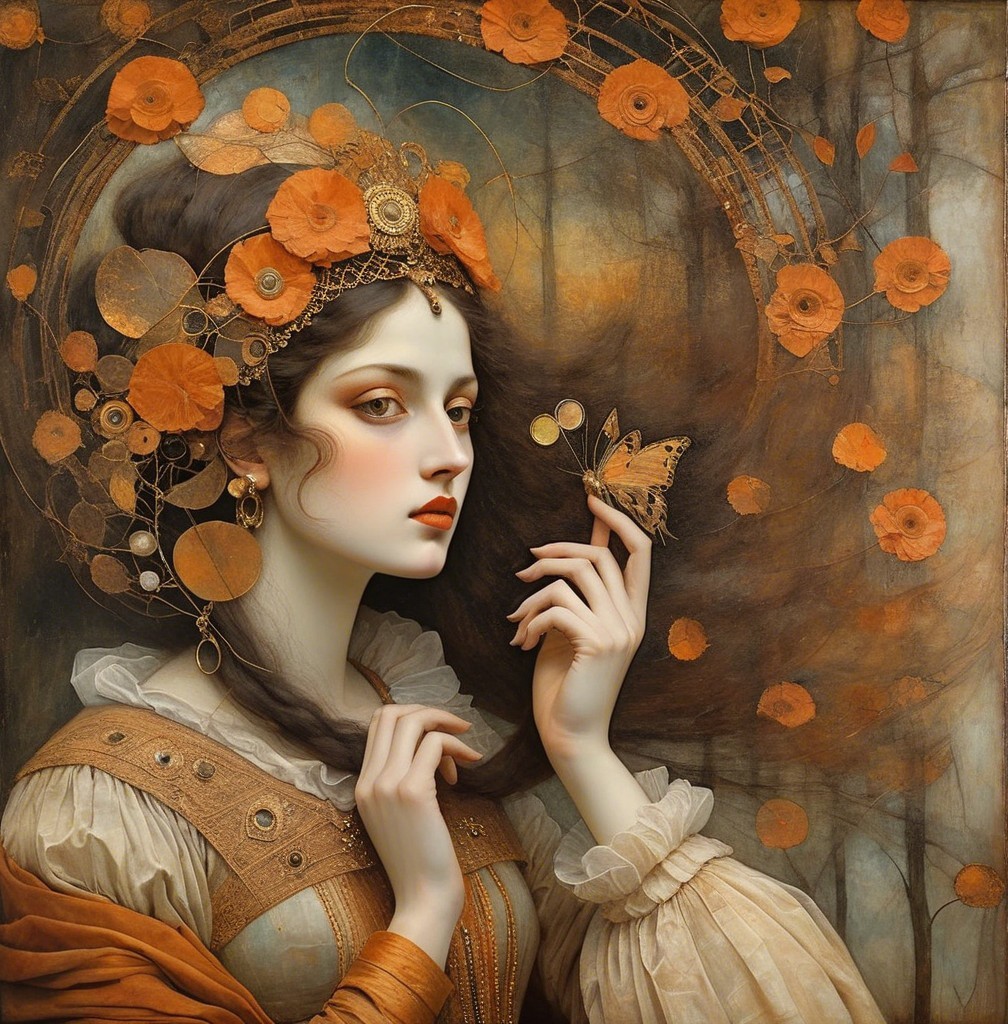 Emerging chrysalis. foggy nostalgia, portrait in Burnt umber and salmon gold, smoke and mirrors, patina of, battery acid, art brut, moody, somber, desaturated colors, in the style of Paul Klee, Arthur Rackham Dark and moody oil painting of a woman with piercing black eyes, inspired by the works of John Singer Sargent and Edgar Degas, long shot, realistic texture, dramatic lighting, intricate details on clothing and Magical woman fading tones of melancholy and summer nostalgia, soulful portrait, in burnt umber, plutonium, patina of mercury glass, tea stains, art brut, moody, somber, desaturated colors, in the style of Paul Klee, Banksy, Arthur Rackham, based on Prompt by KRW