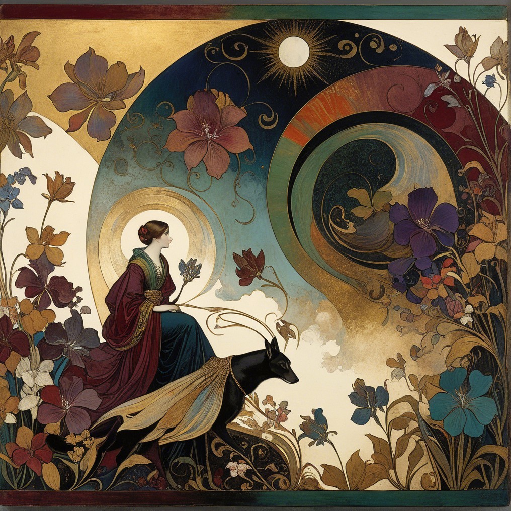 The image features a serene woman with flowing hair, adorned with a floral motif and jewels. She gazes thoughtfully, framed by vibrant colors, a sun, and elegant lilies, embodying beauty and grace.
