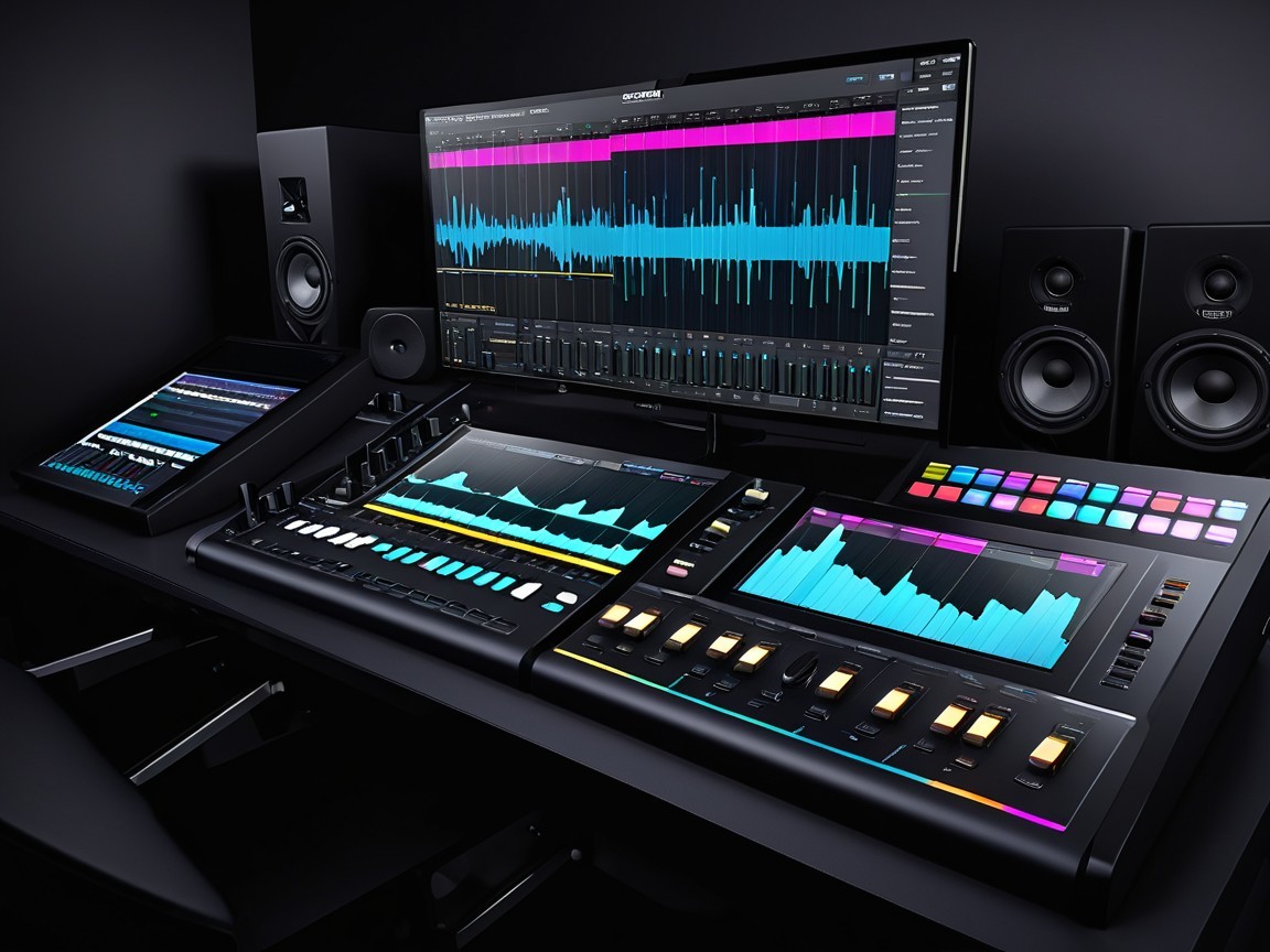 A modern music production setup featuring a large screen displaying colorful waveforms, a digital audio workstation, and an array of controllers and speakers, all designed for audio mixing and editing.