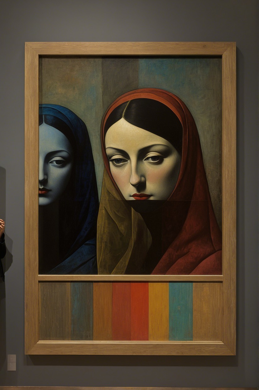 A striking portrait featuring two women in colorful scarves. One wears a blue scarf, the other a red one, both with strong expressions against a muted background. Rich details and warm tones enhance the emotion.