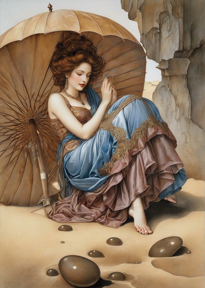 A classic painting of a woman with an umbrella on a beach, holding a pendant, in a flowing dress and sandals, exuding a serene aura.