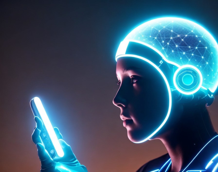A digital illustration of a humanoid robot with a glowing, circuitry-infused head, holding a luminescent rod, set against a dark background.