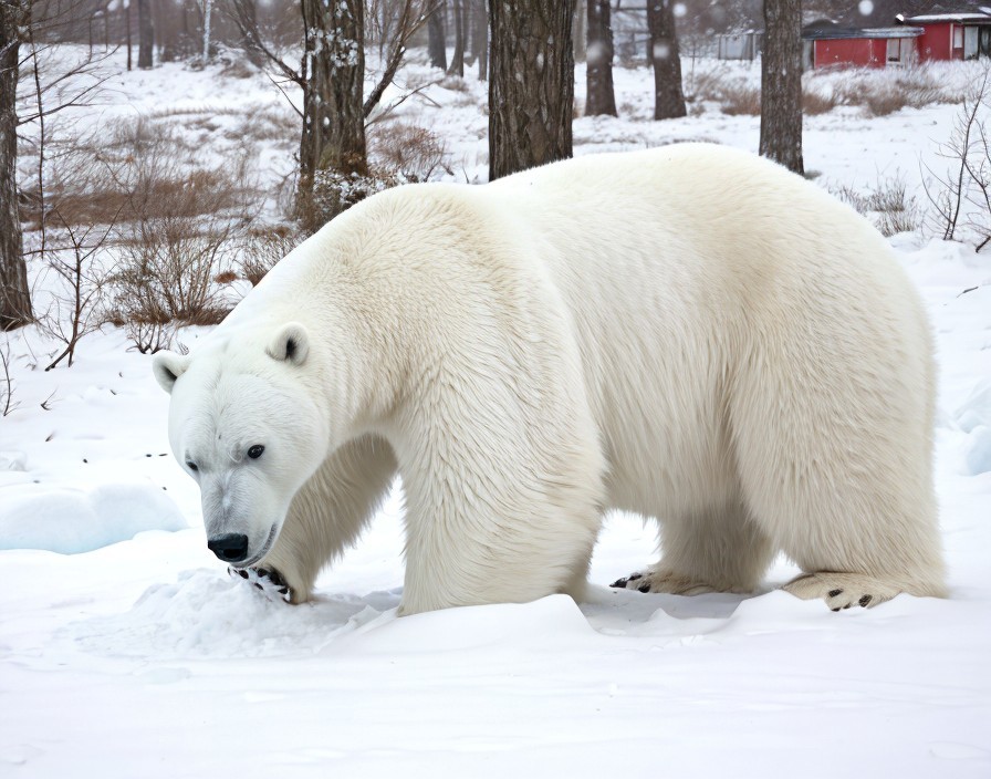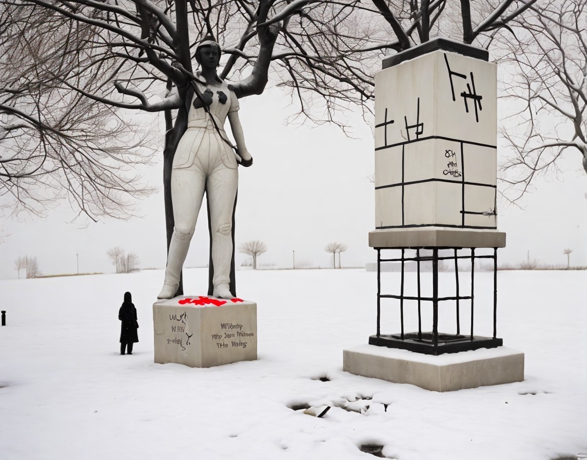 Three sculptures resembling abstract, colorful blocks stand in snow, with trees and a car in the background.