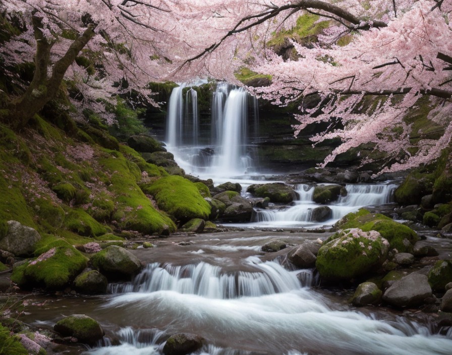 Tranquil Stream with Waterfalls and Cherry Blossoms