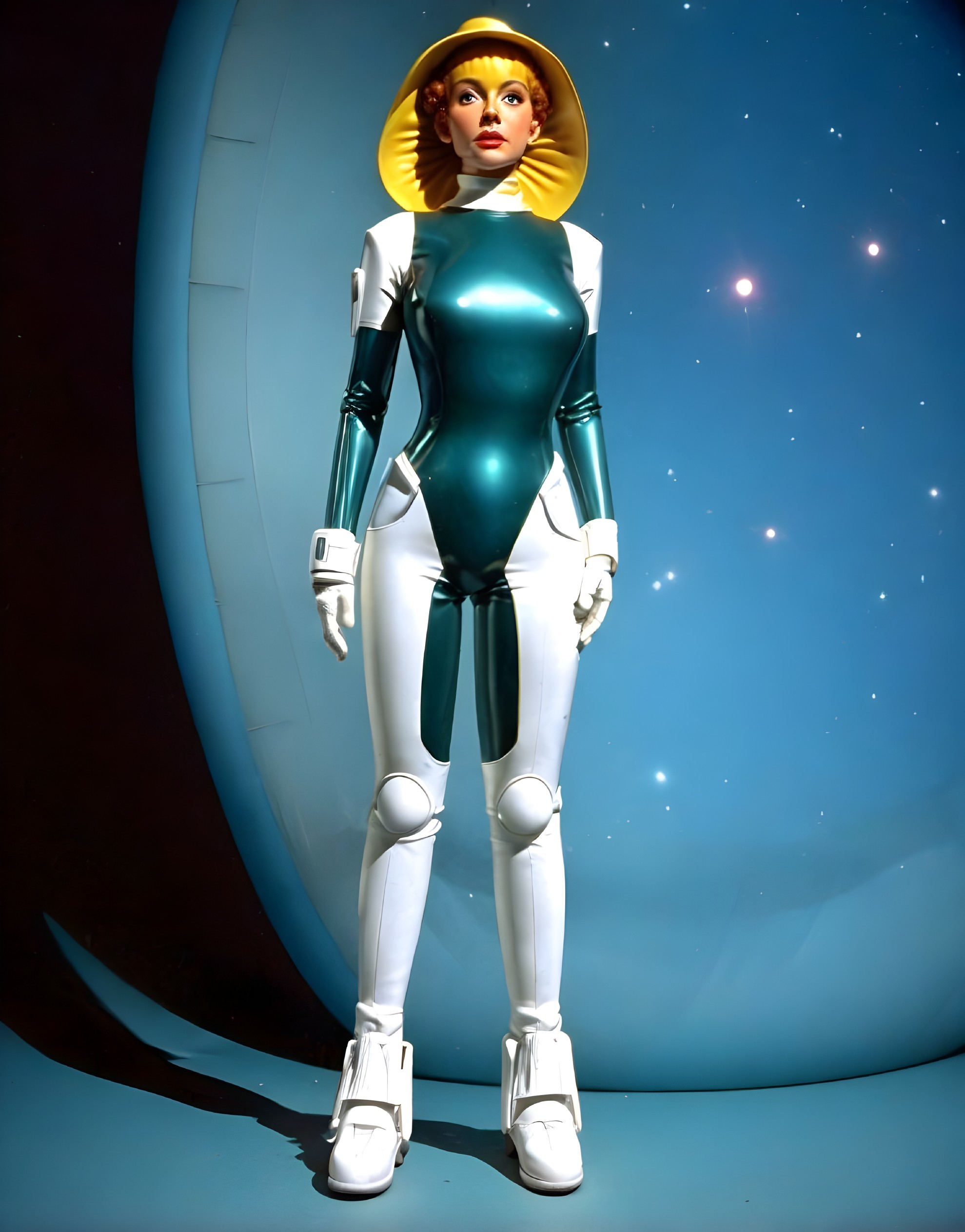 A stylized female figure in a futuristic white and teal spacesuit with a halo-like headpiece against a cosmic backdrop.